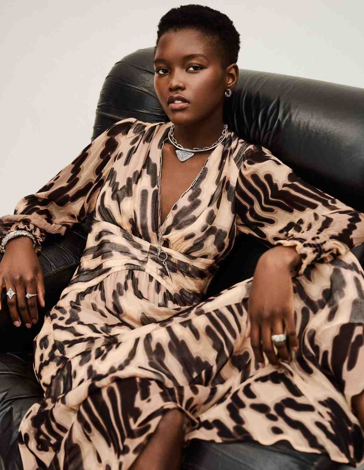 The Amor dress from Ba&sh is simply exquisite, designed in a very subtle animal print on a soft pink base with warm chocolate brown and black tones. It is a wrap style, v neck midaxi dress, a winning style from our most-loved French designers.