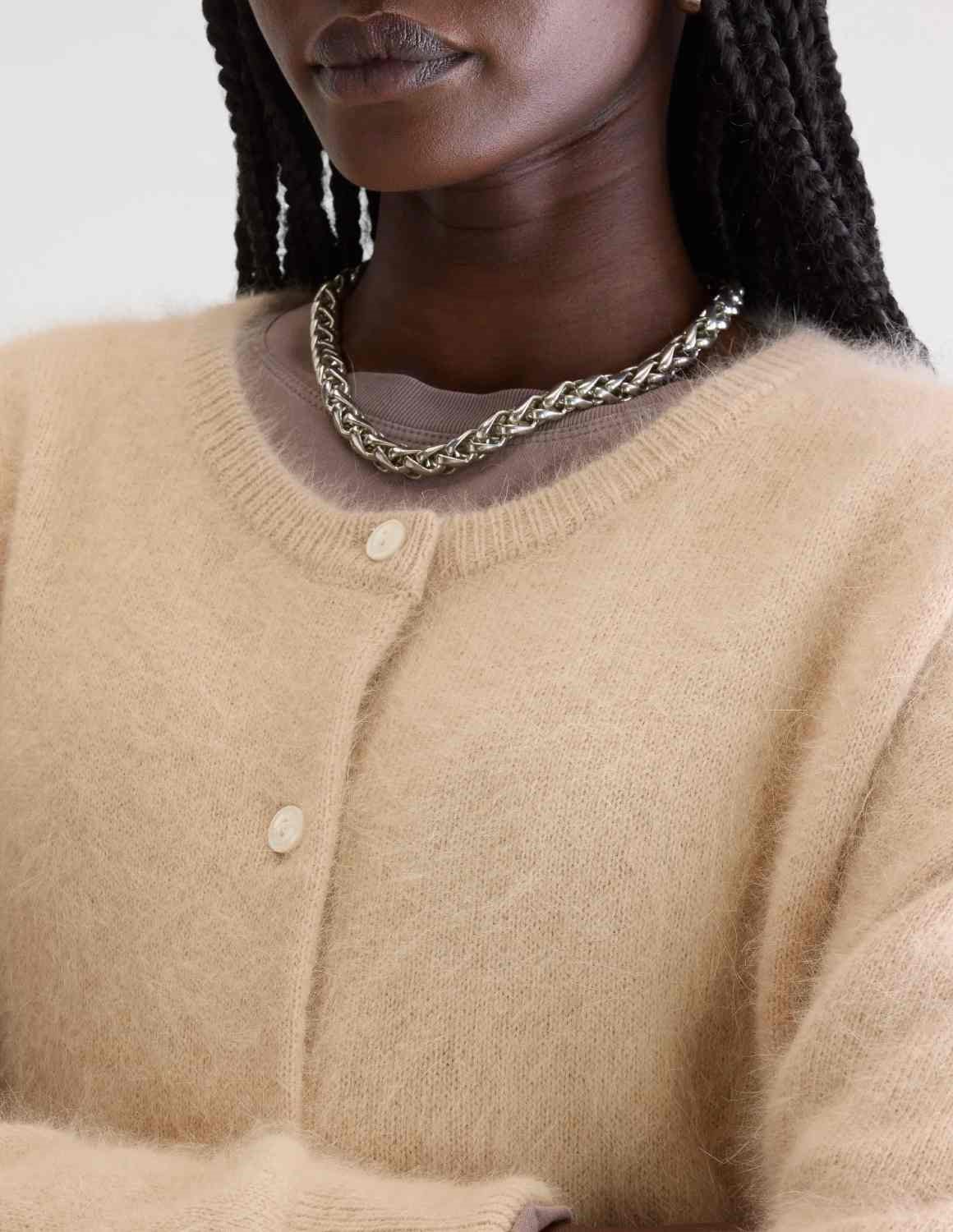 The Dathan crewneck cardigan from Bellerose is so cosy, designed in a soft angora blend, available in ivory or mid grey. Style with all your favourite denim this autumn. Such a useful layering piece, this will become your go-to cardigan.