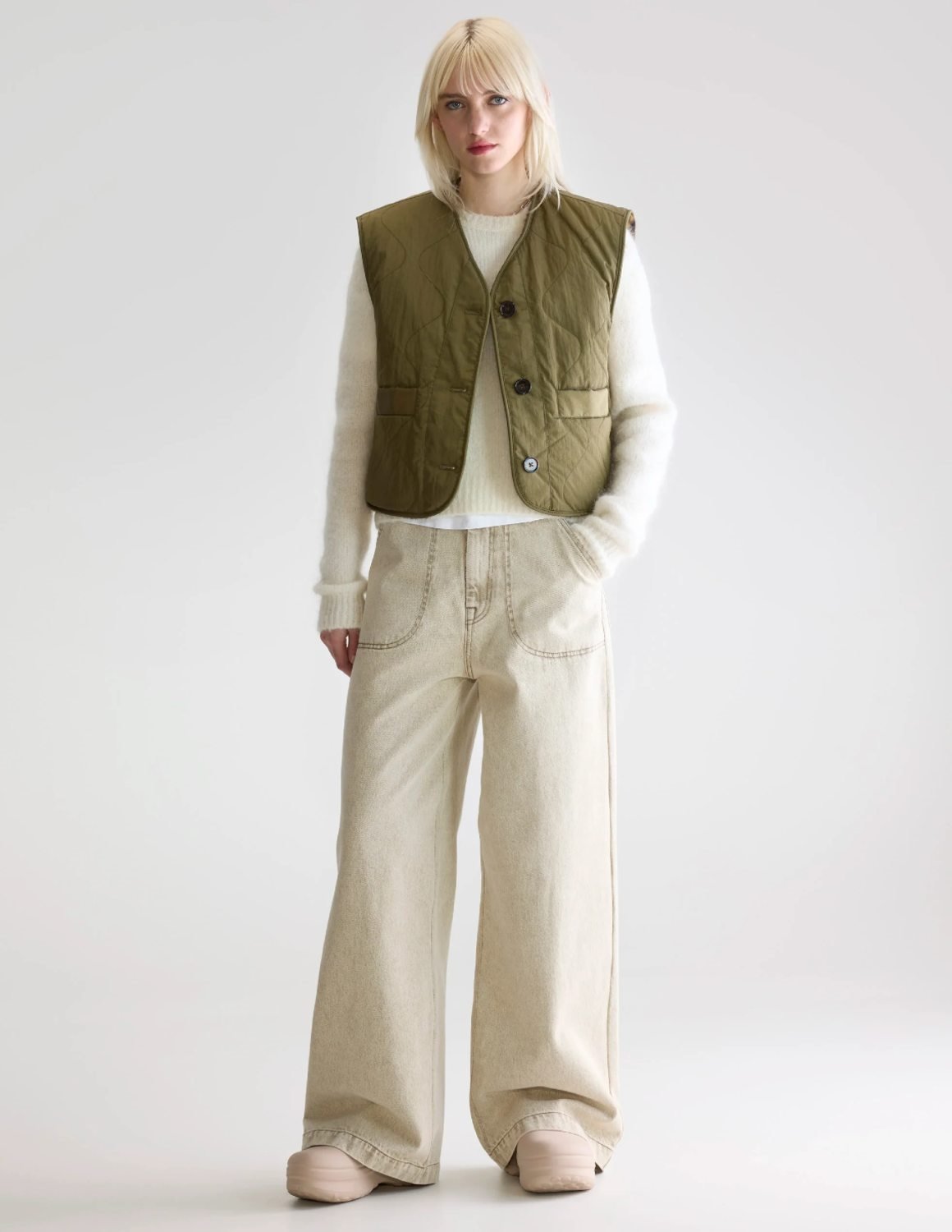 How gorgeous is the Eloise reversible gilet from Bellerose! Such a cute sleeveless jacket with leopard faux fur on one side and quilted khaki wavy fabric on the other. The gilet is the ultimate layering style for your wardrobe as the weather turns cooler.
