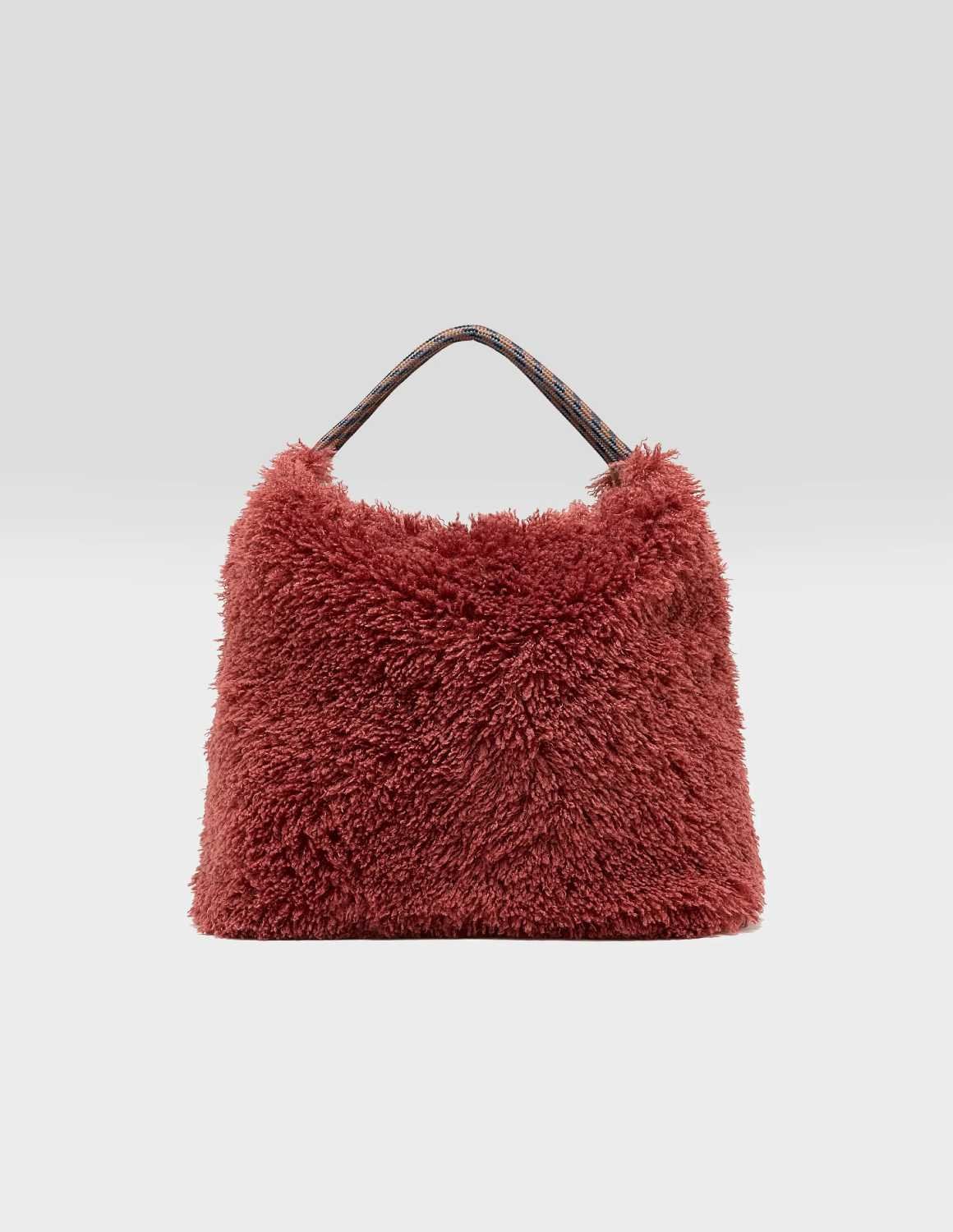 The Hela bag from Bellerose is a reversible faux fur shoulder bag with rope handles and a contrasting, removable shoulder strap. One side is in deep burgundy faux-fur and the other in tan faux leather.