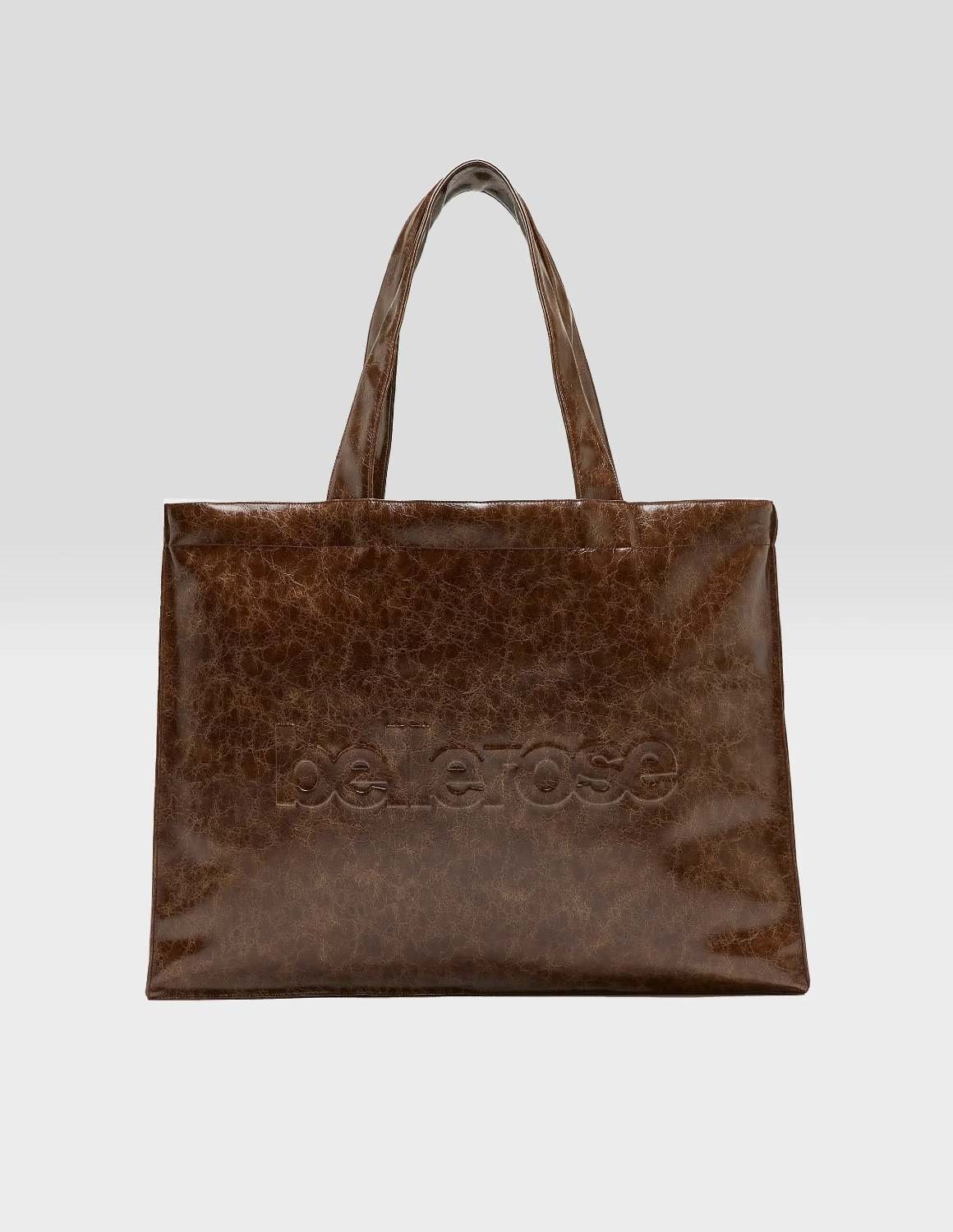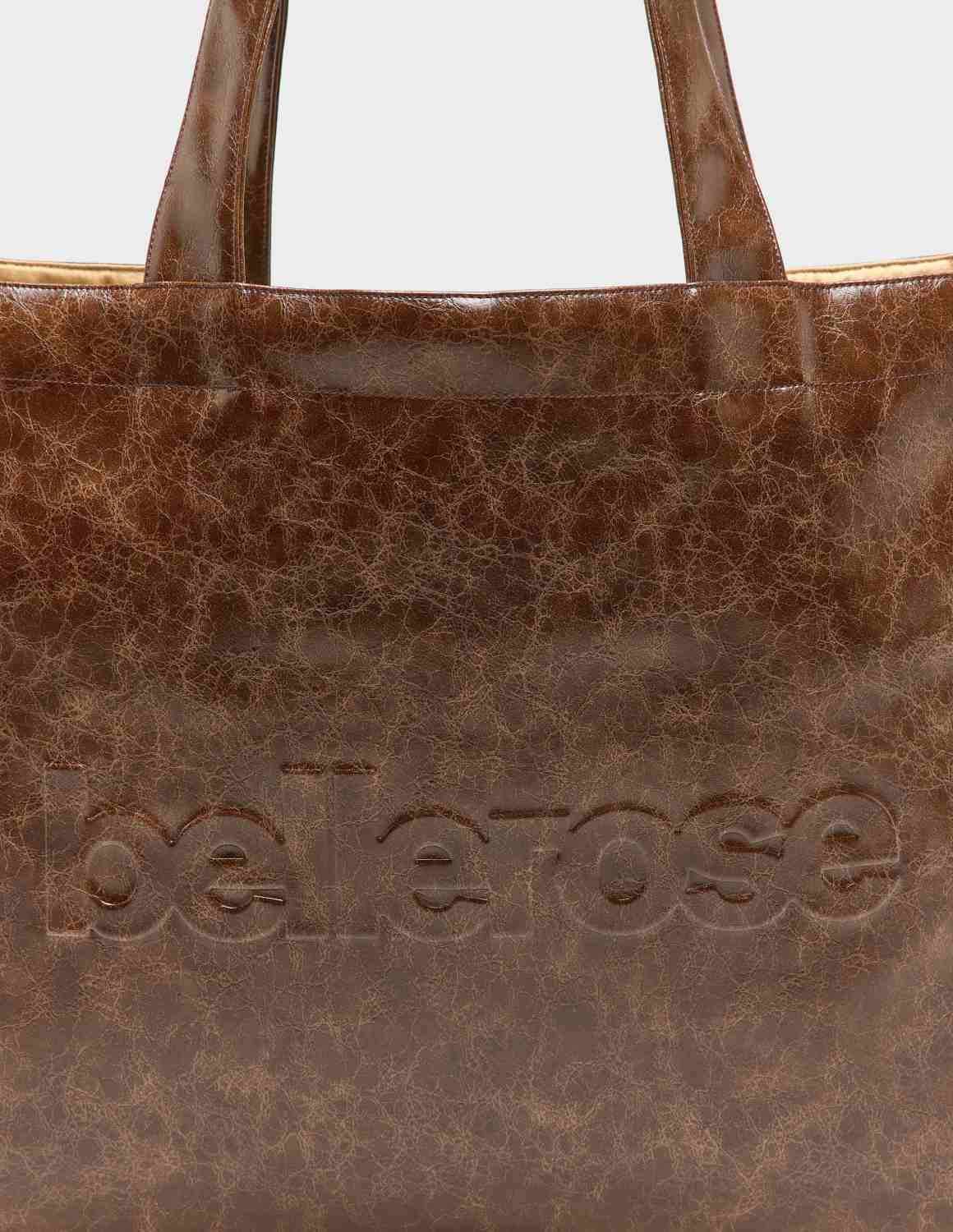 The Hette bag from Belrose is a large shopper in dark brown crackled patent faux-leather, lined with beige fabric, and featuring an embossed 'Bellerose' logo.
