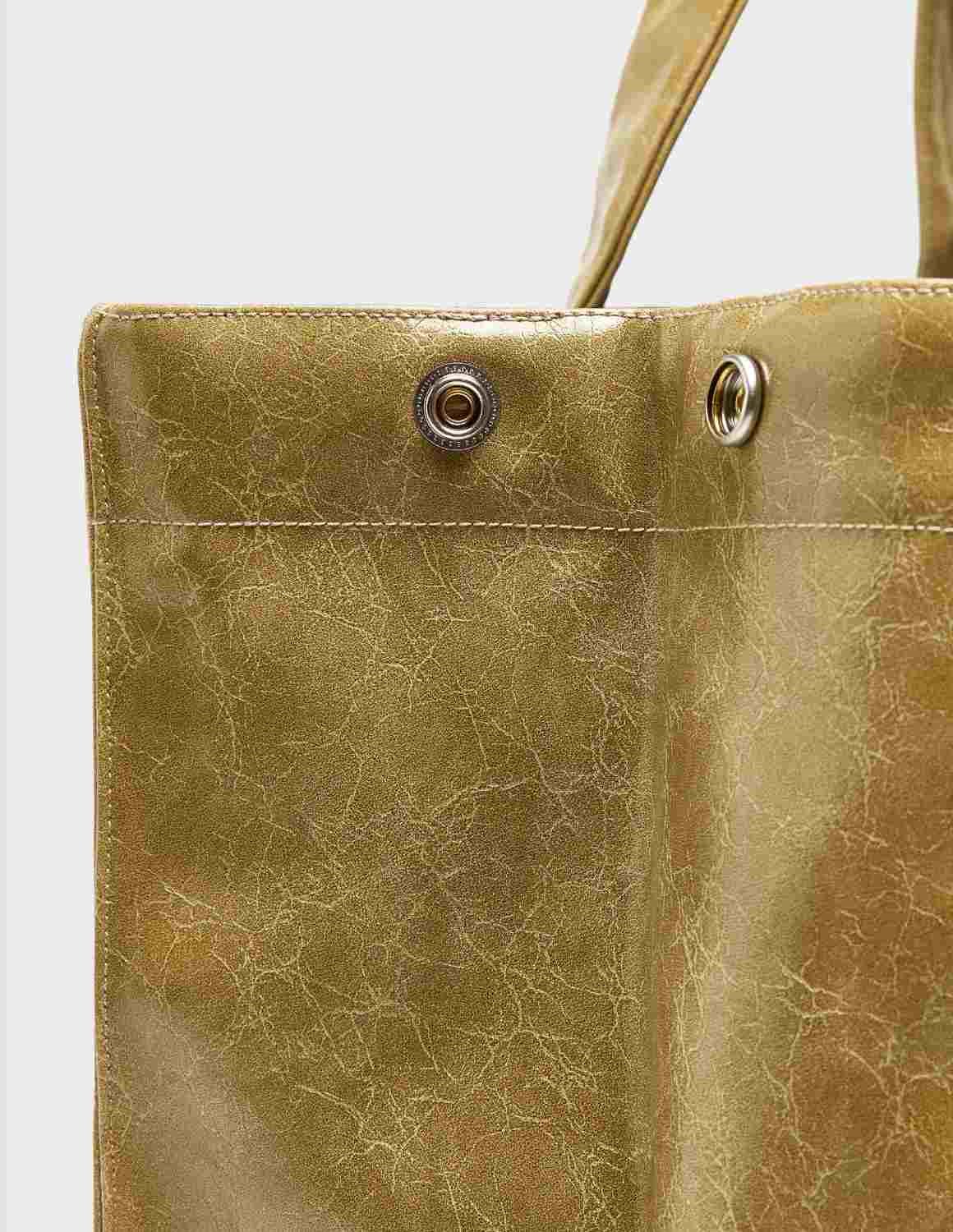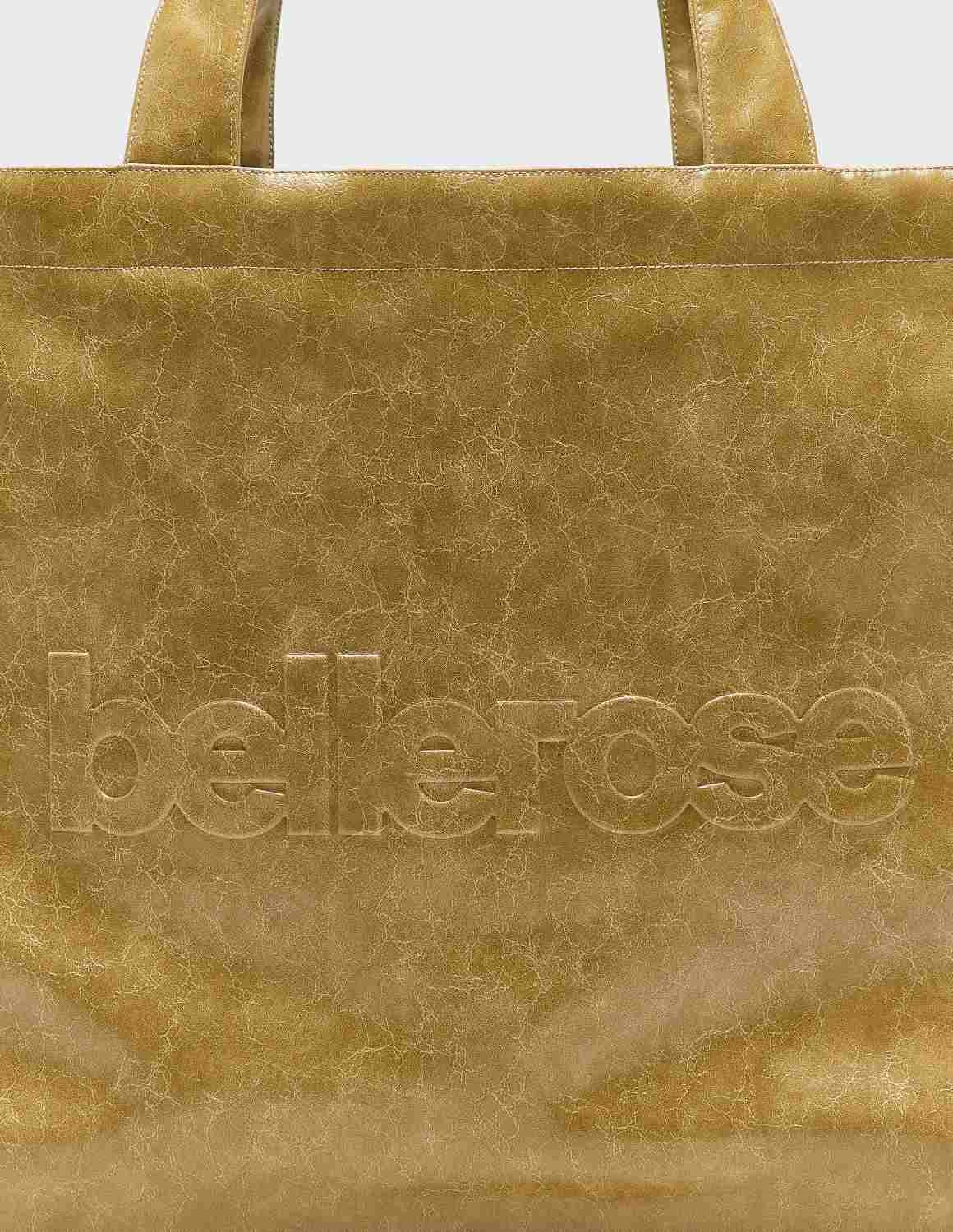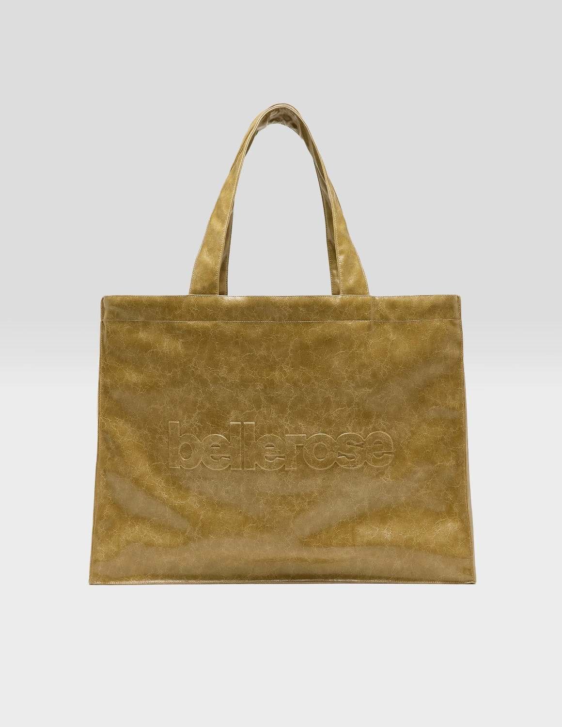 The Hette bag from Bellerose is a large shopper in dark beige crackled patent faux-leather, lined with burgundy fabric and featuring an embossed 'Bellerose' logo.