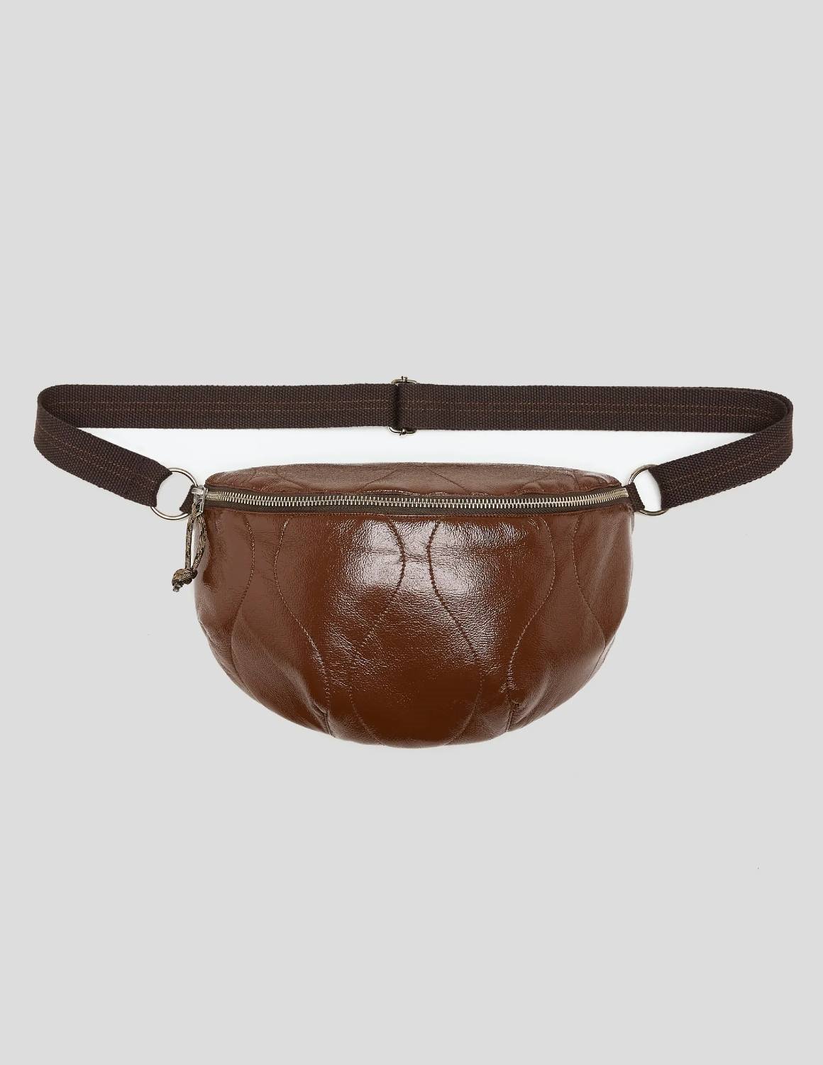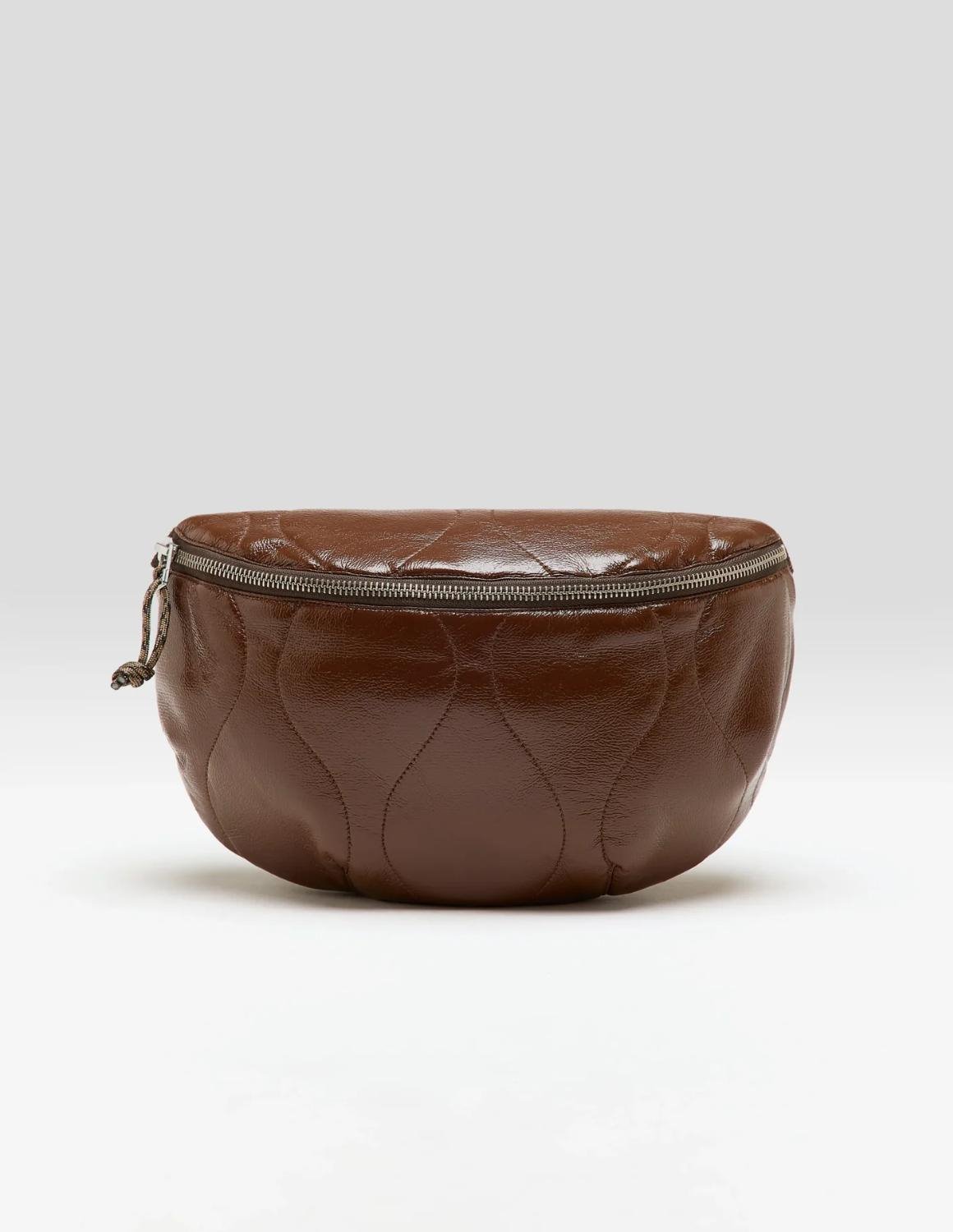 The Hosie bag in coffee is a zip-front sling bag from Bellerose. it comes in coffee brown glossy faux-leather with a wavy pattern and has an adjustable cotton strap.
