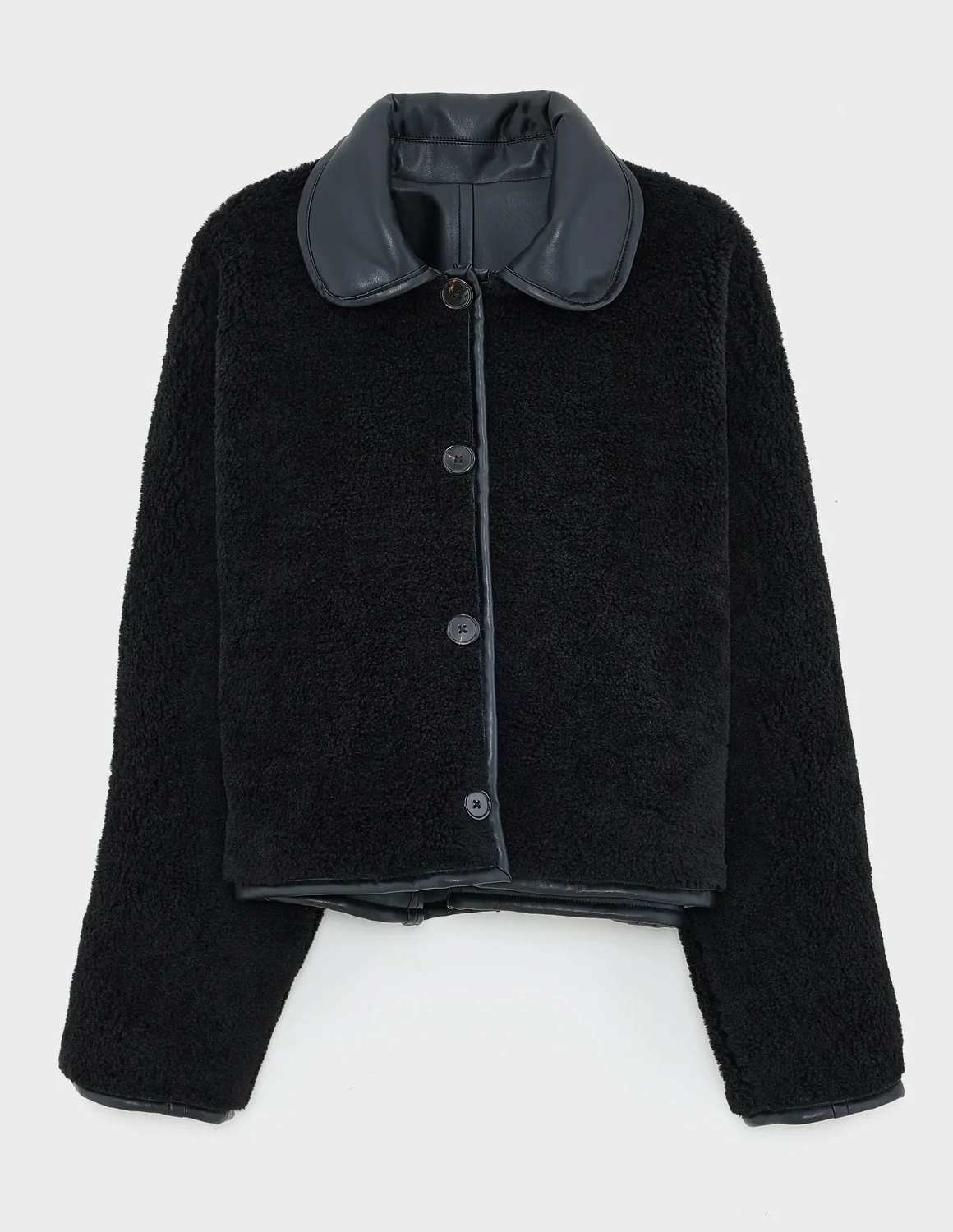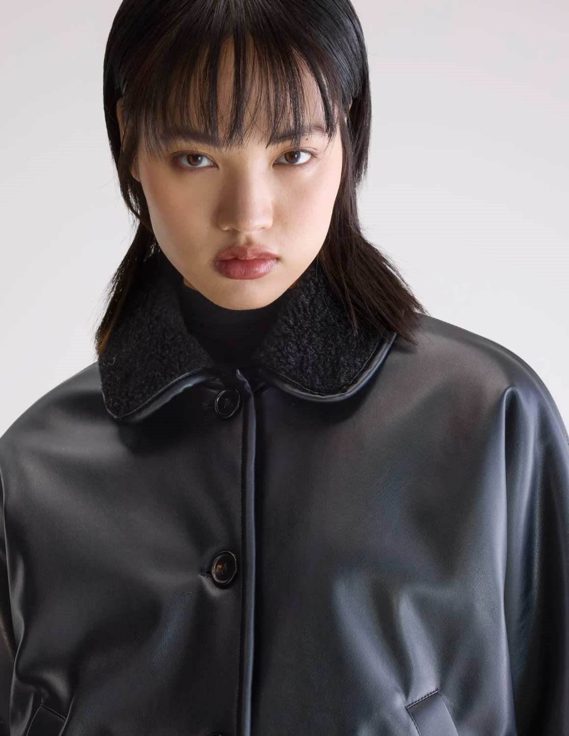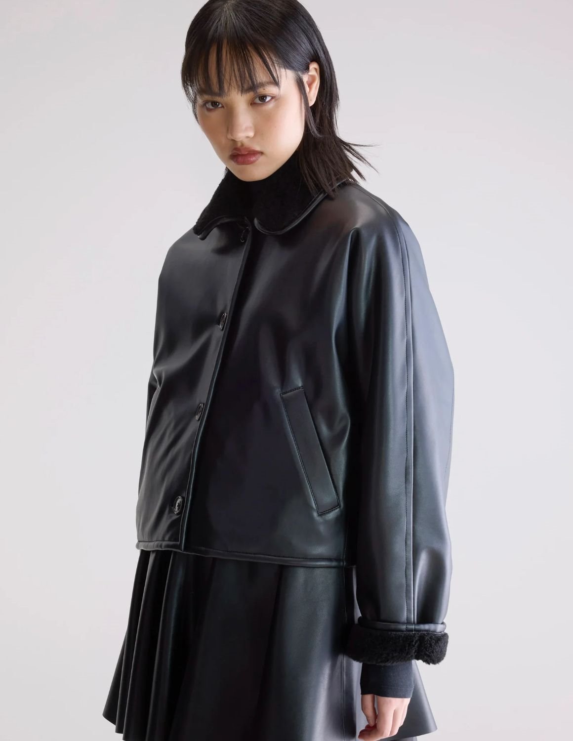 The Josh jacket from Bellerose is a relaxed reversible jacket in black faux leather with a tonal faux fur collar and lining. A great choice as the weather gets colder.