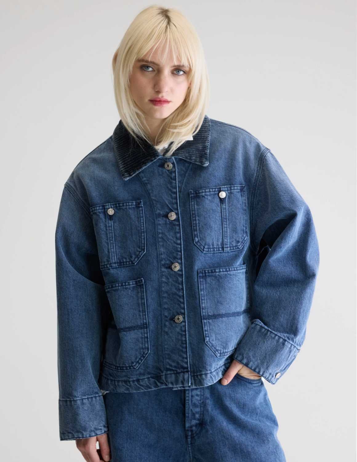 The Pila jacket from Bellerose is an oversized mid-blue denim jacket with a loose, boxy fit for a workwear-inspired look. It features a button-up front, corduroy tonal collar, and two sets of front pockets.