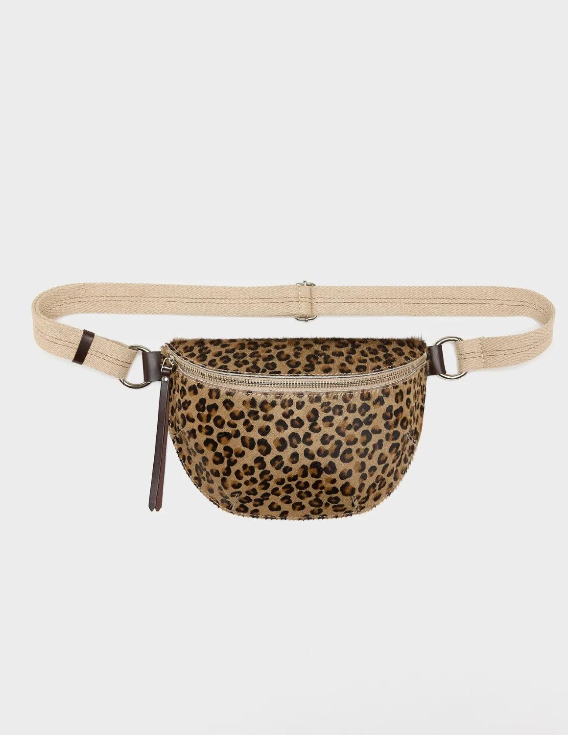 The Rosie half moon sling-bag from Bellrose is the essential small bag for the new season. Made in leather with a leopard print pony-hair texture, it has a front zip and the back comes in a smooth cognac leather.