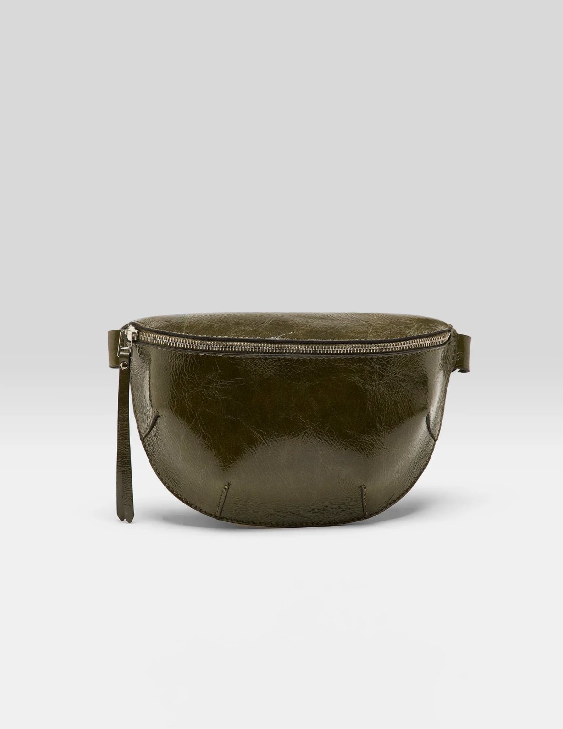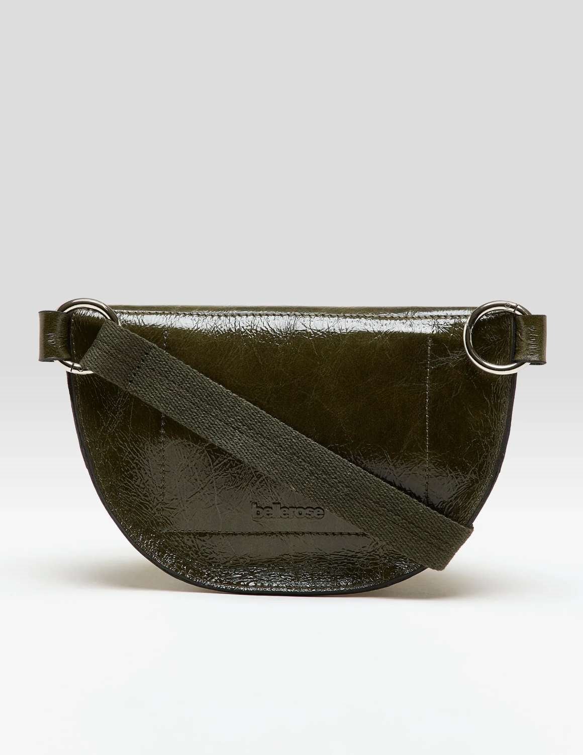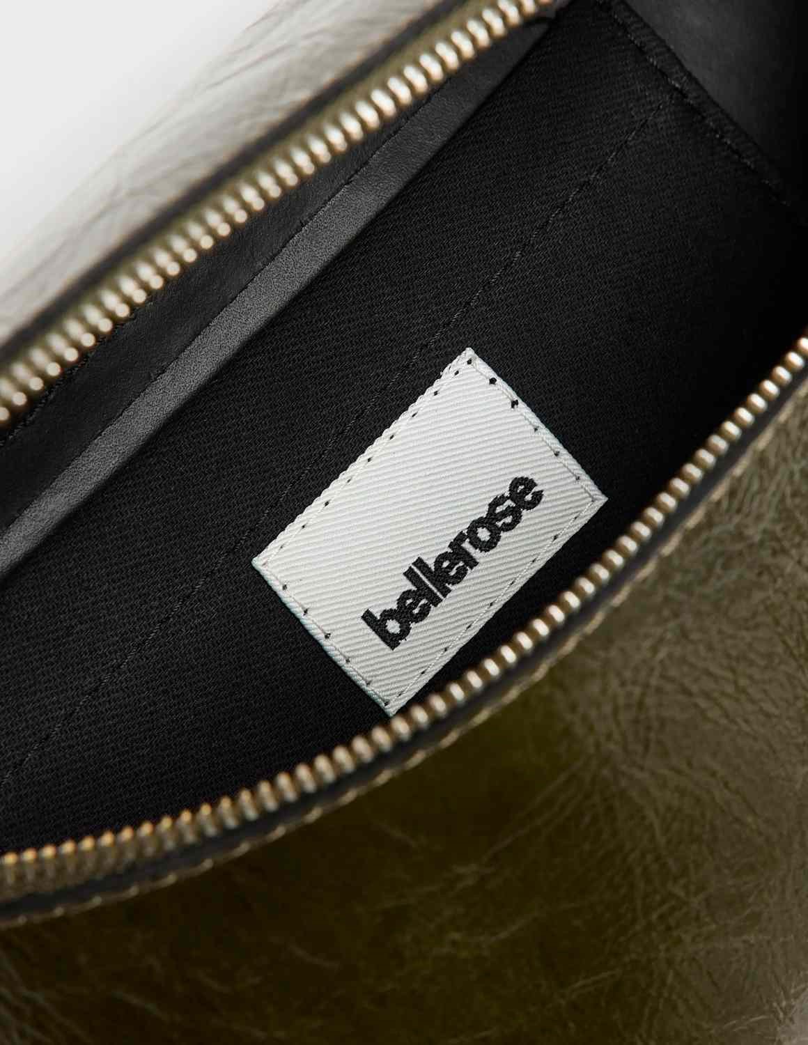The Rosie half moon sling-bag from Bellrose is the essential small bag for the new season. Made in crinkled glossy dark green leather, it has a front zip and adjustable strap.