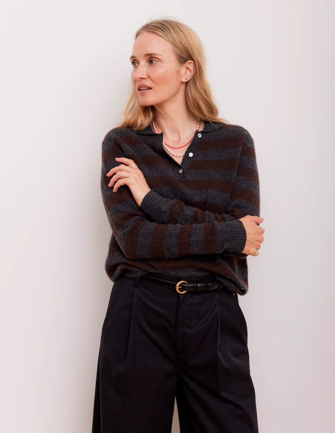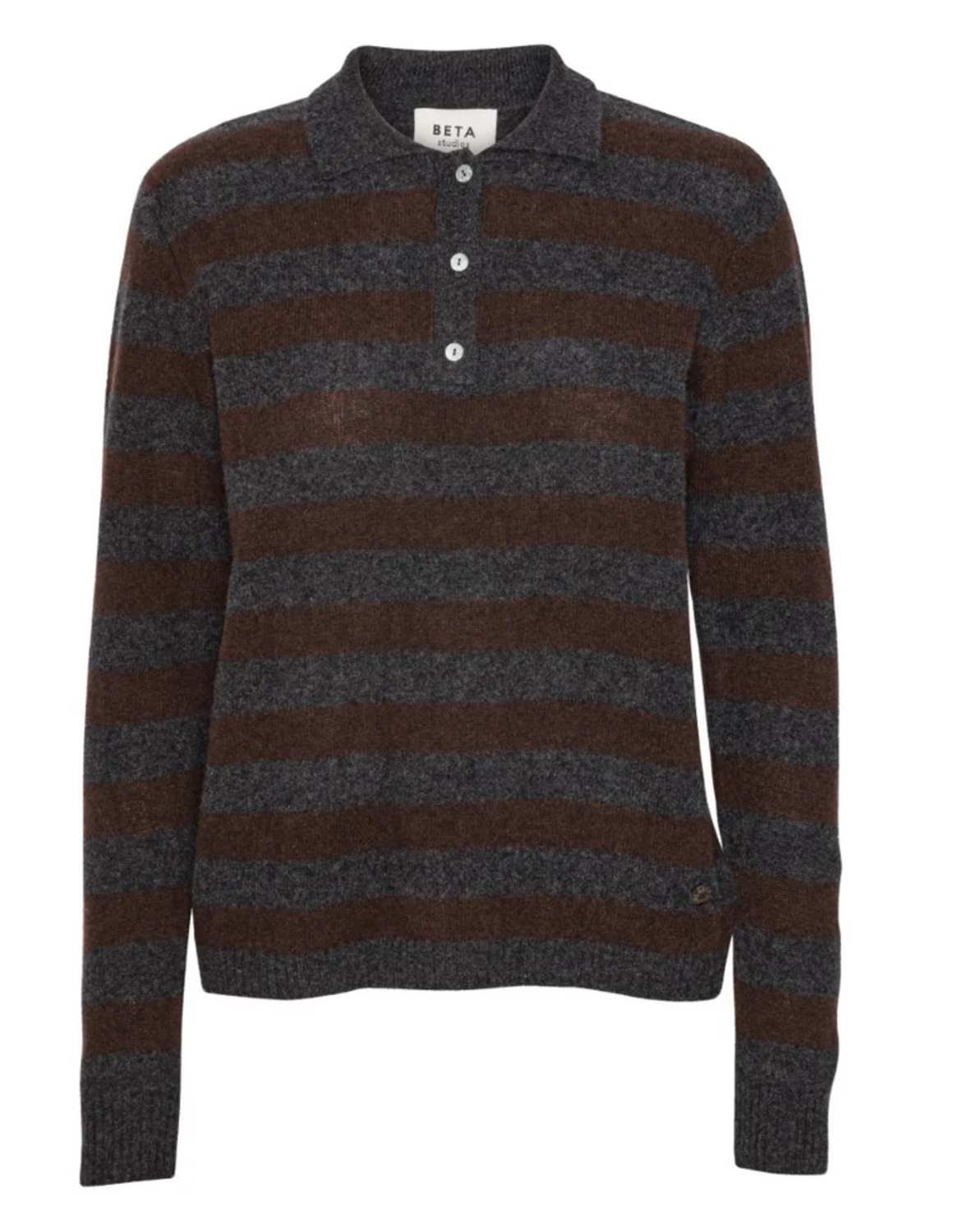 The Lizzie polo from Beta Studios in grey and coffee brown stripes is a timeless style in ultra-soft cashmere that is destined to become a classic. Made from 100% cashmere from Inner Mongolia, it is designed with a collar and three mother-of-pearl buttons, so can be worn open or buttoned up, and offers endless layering options. Combine it with jeans or wear it under a blazer.