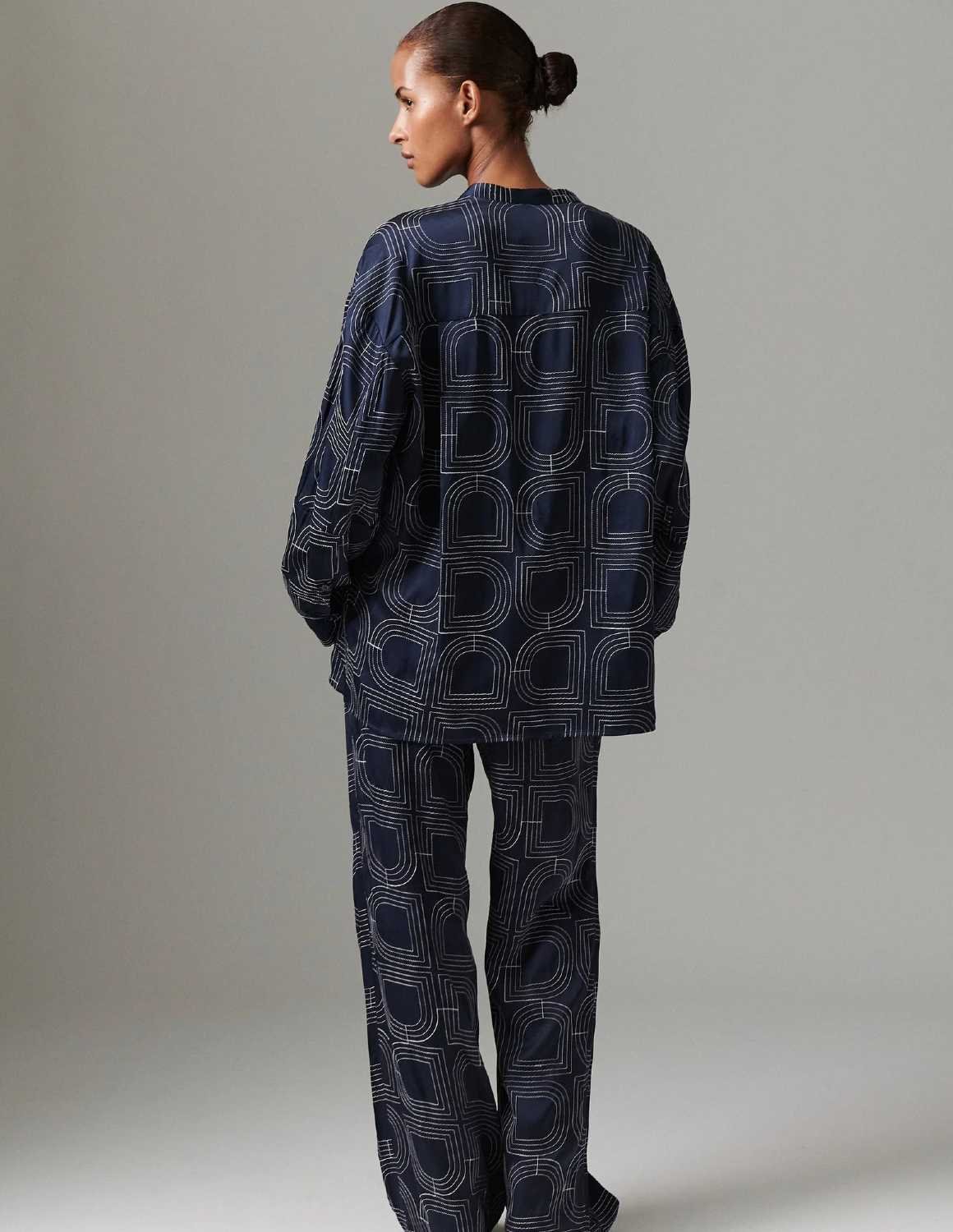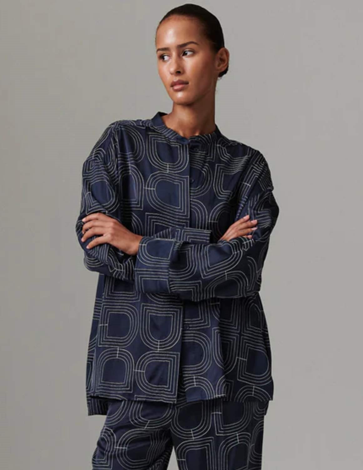 The Kerry from Day Birger et Mikkelsen is a lovely, fluid, mock-collar shirt in a sophisticated dark navy with contrasting geometric stitch pattern. It is front buttoning with wide sleeves, a dipped hem and buttons at the wrists. Stylish, relaxed and comfortable, it is a matching piece to the Phoebe trousers. Size down for a more fitted look.