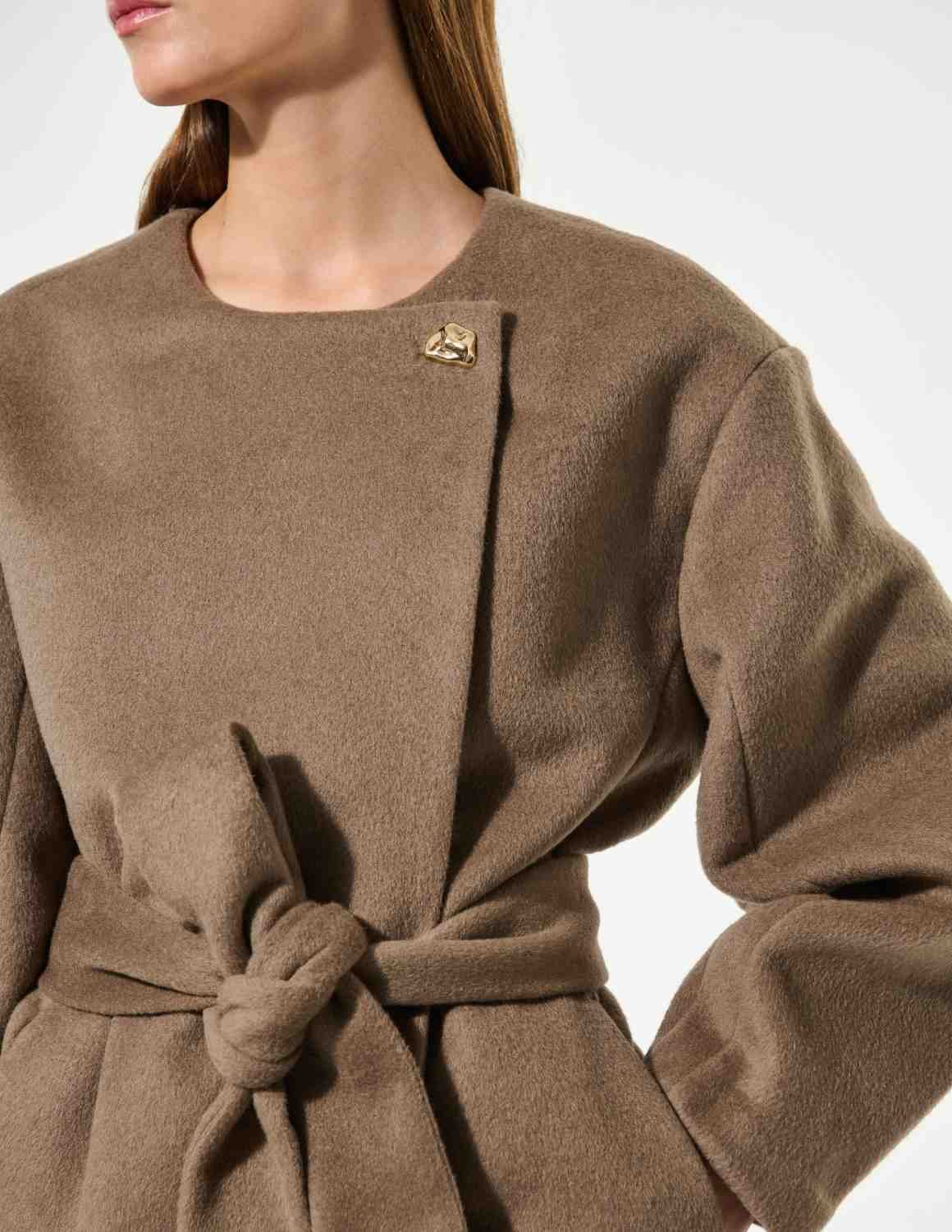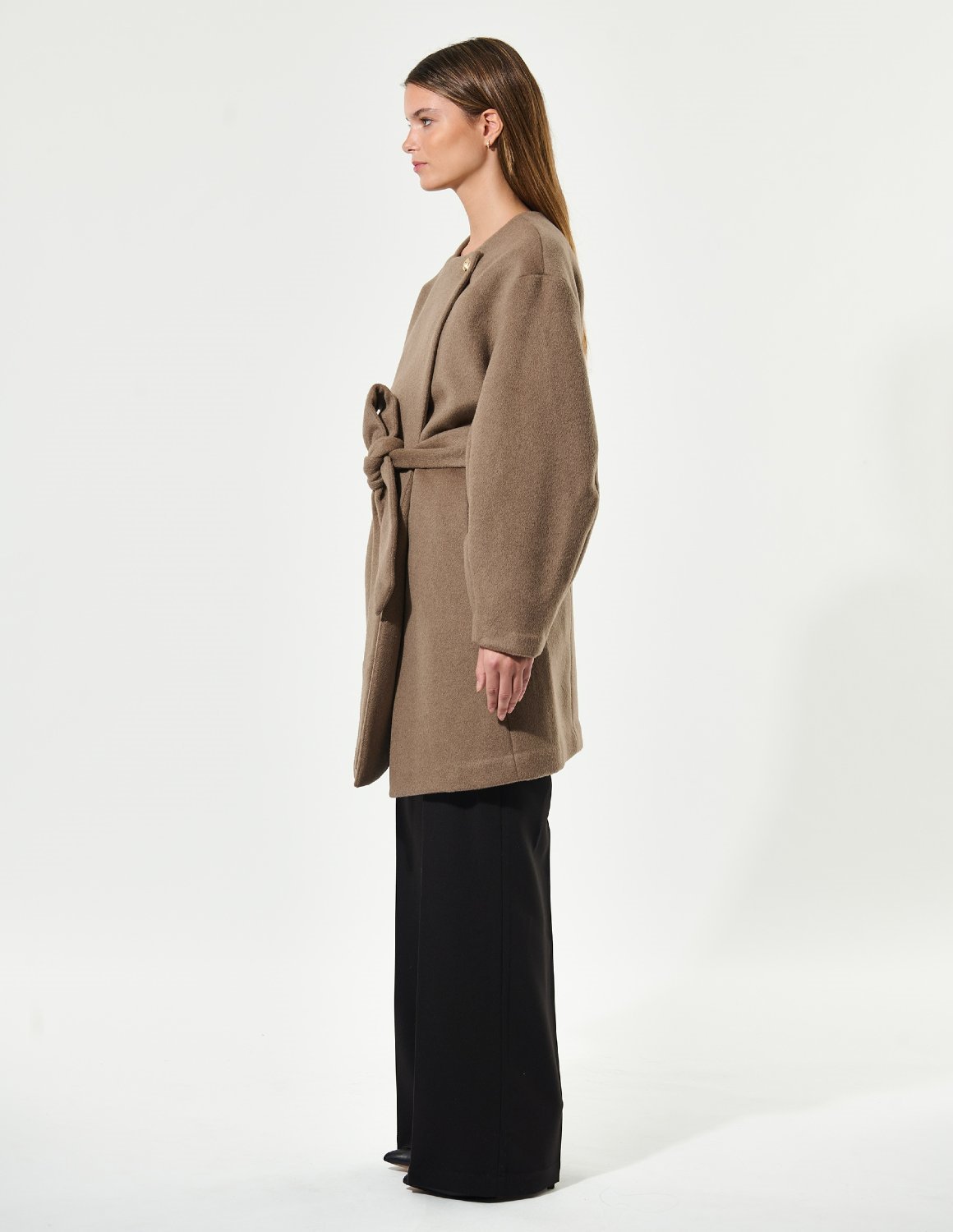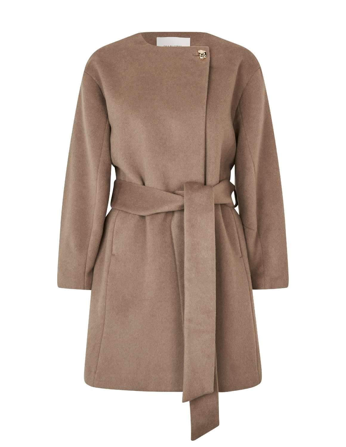 Effortlessly stylish, Dea Kudibal bring you the collarless CheriDEA beige coat with an asymmetric front, an elegant addition to your wardrobe. The front panel is held in place with a single decorative button at the shoulder. It has sculptural ‘cocoon’ sleeves, slit pockets in the side seams and a self fabric belt draws it into the waist. The coat is fully lined and falls to just above the knee. - Fully lined