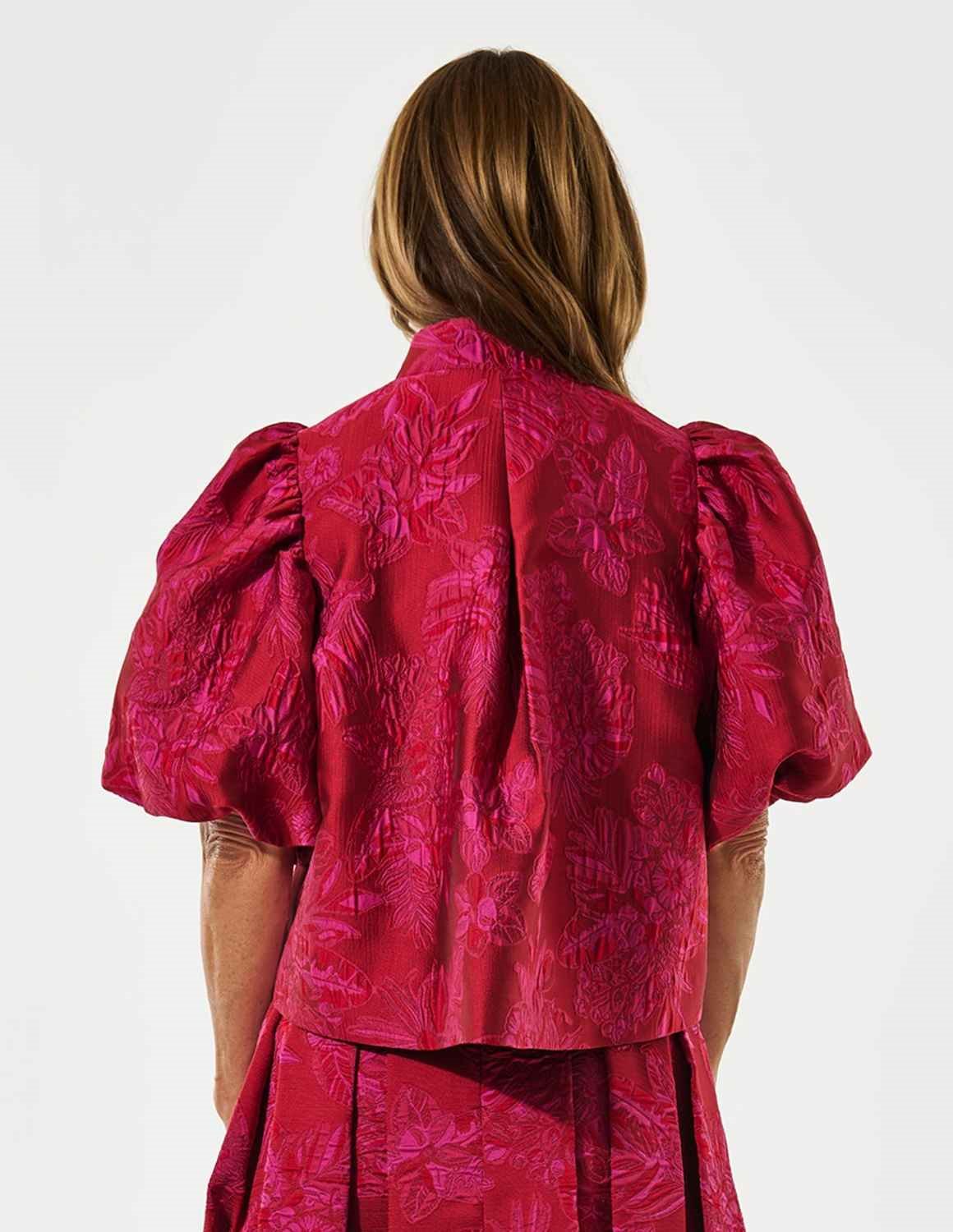 This sophisticated and stylish cocktail-style jacket from Dea Kudibal is the perfect addition to any black outfit this party season! Designed in a striking red jacquard, the OliviaDEA jacket has a striking silhouette due to its cropped loose fit and voluminous half length puff sleeves. It has a stand collar, hook and eye fastening at the neck and a deep box pleat at the back to add more volume. Pockets in the seam are a practical finishing touch. Wear over anything black for a dramatic yet elegant look.