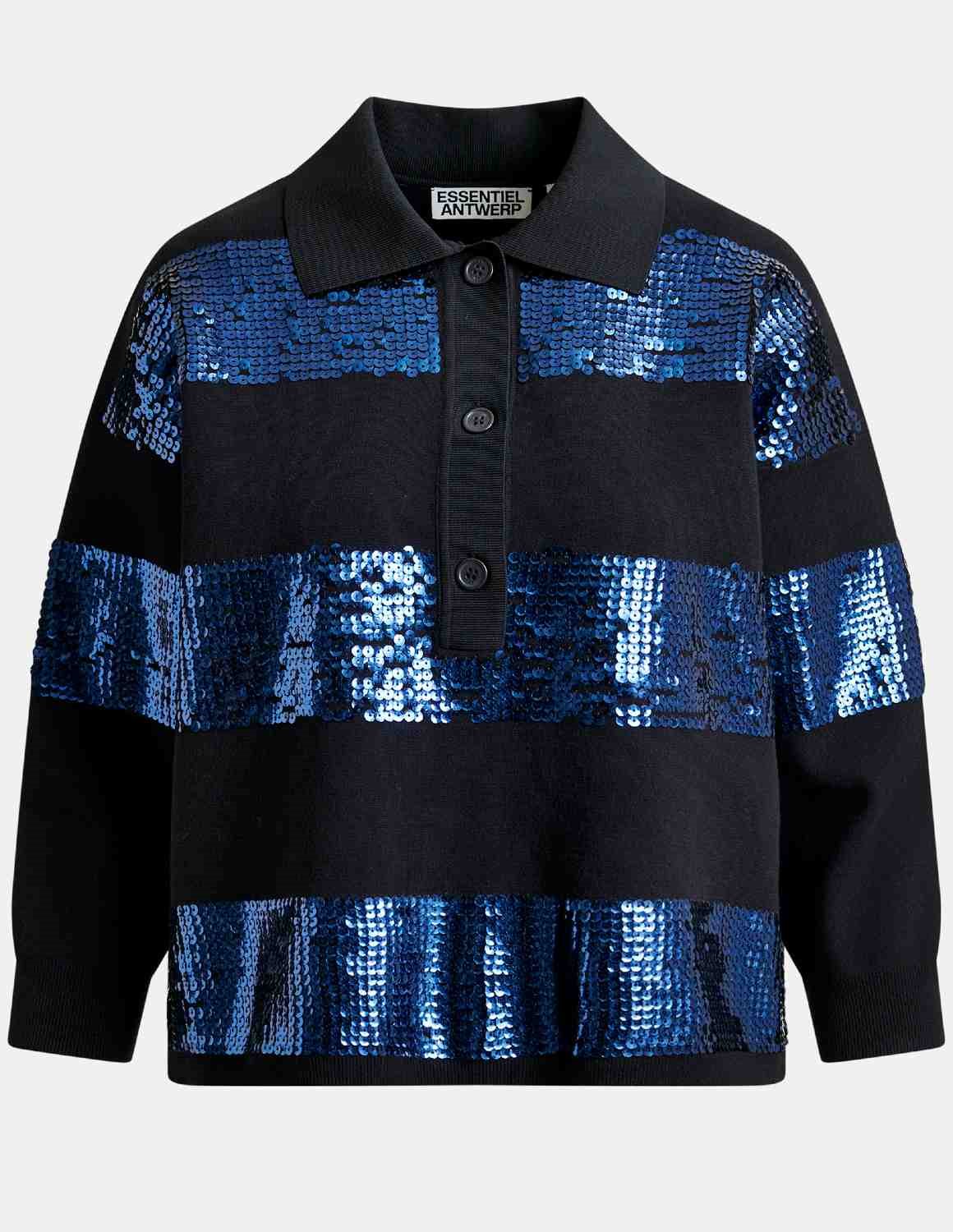 The Illuminati from Essentiel Antwerp is a fine-knit polo top which blends sporty structure with statement sparkle! Designed for a relaxed, boxy fit, it features sequin-embellished stripes across the body and sleeves, contrasted by a bold collar and placket. Dropped shoulders, 3/4 sleeves, and a subtly curved hemline add ease to the silhouette, while ribbed trims provide a clean finish.