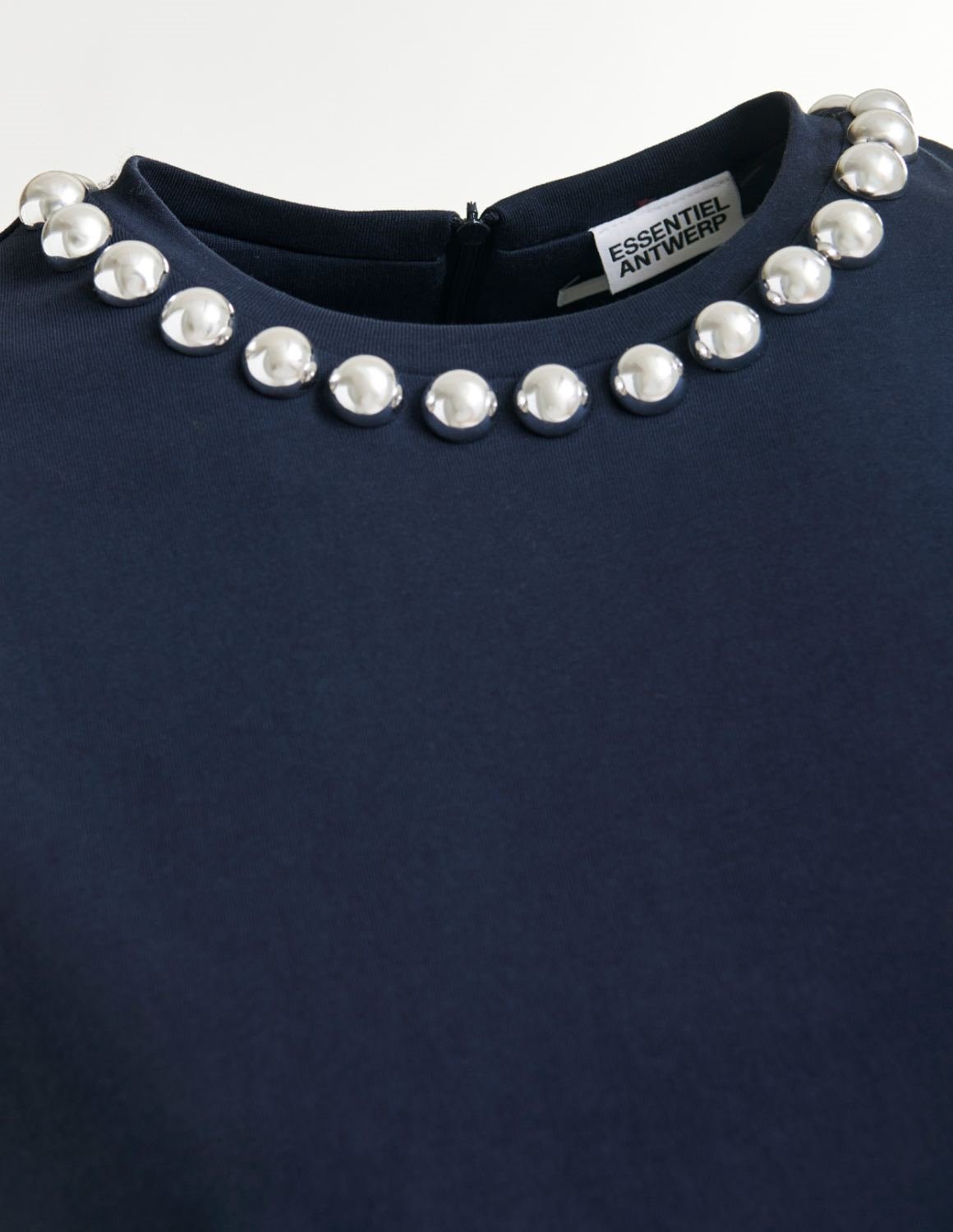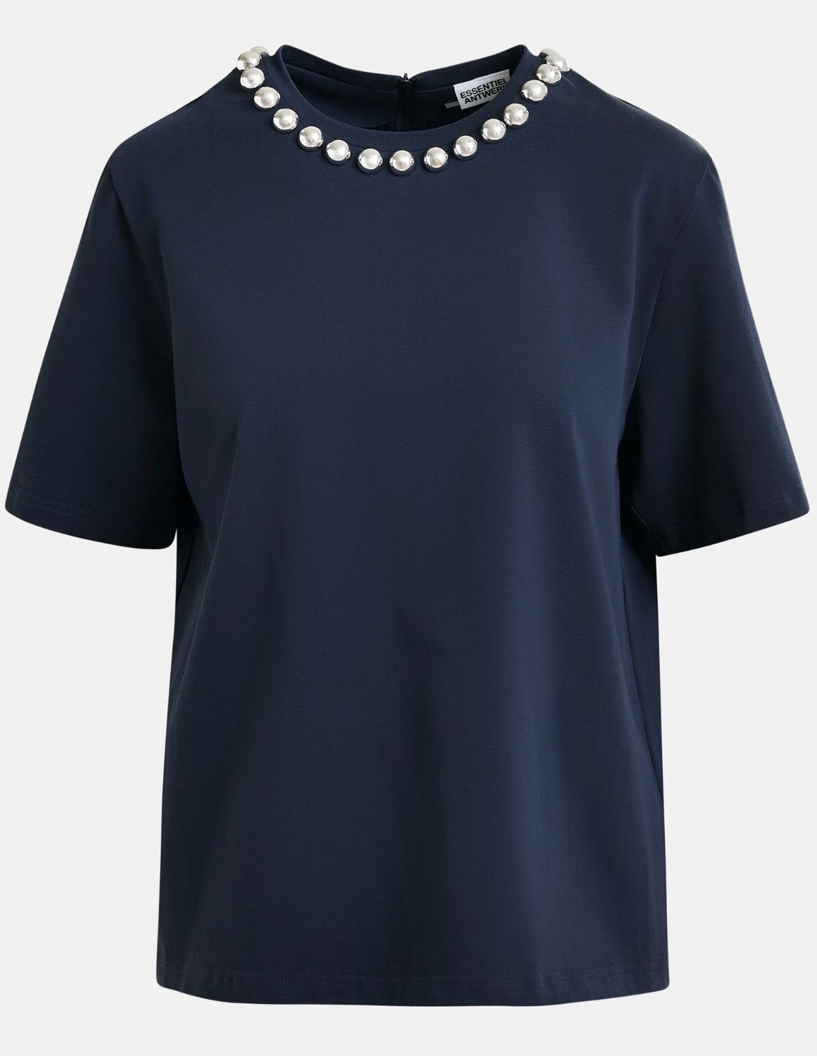 Essential Antwerp Intenso cotton T-shirt is cut for a boxy, relaxed silhouette, it features short sleeves and a clean round neckline adorned with oversized metallic pearl-style embellishments for an elevated twist. A concealed zip at the back adds a polished finish. Wear it tucked into tailored pants or let it elevate your go-to denim.