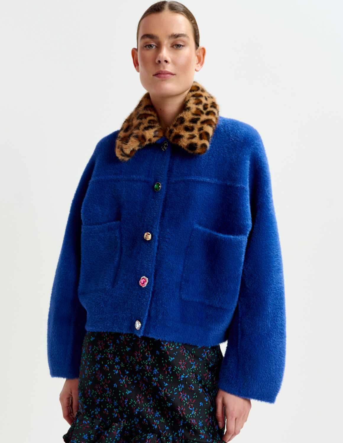 The Intention cardigan / jacket from Essentiel Antwerp is an eye-catching piece, designed in their iconic fuzzy knit. Featuring a mix of playful, mismatched buttons along with two functional patch pockets. This piece blends quirky charm with everyday comfort. The standout feature? A removable leopard-print faux fur collar that lets you switch up your style when you fancy! Perfect for layering or making a statement all on its own.