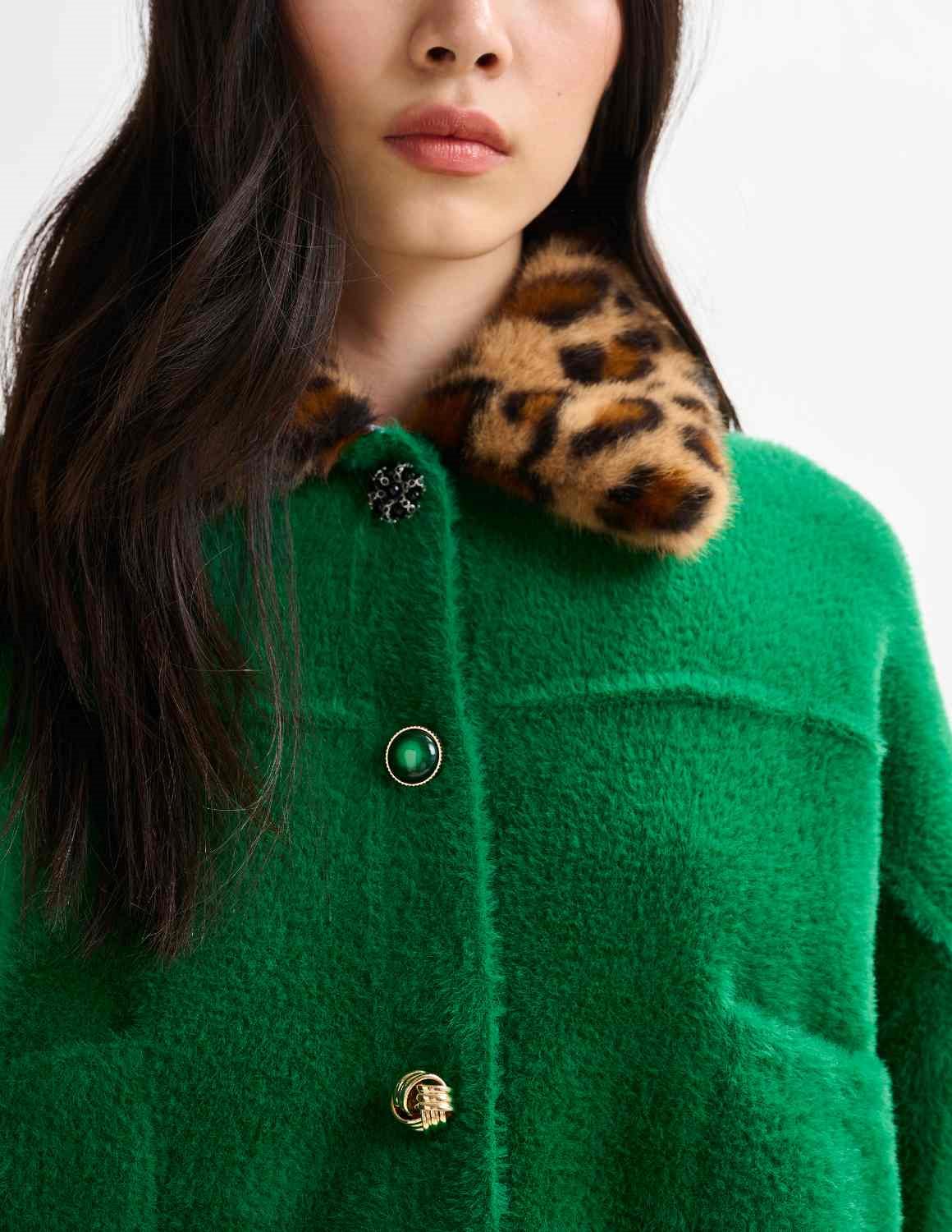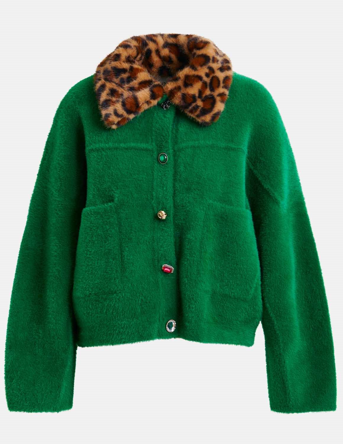 The Intention cardigan / jacket from Essentiel Antwerp is an eye-catching piece, designed in their iconic fuzzy knit. Featuring a mix of playful, mismatched buttons along with two functional patch pockets. This piece blends quirky charm with everyday comfort. The standout feature? A removable leopard-print faux fur collar that lets you switch up your style when you fancy! Perfect for layering or making a statement all on its own.