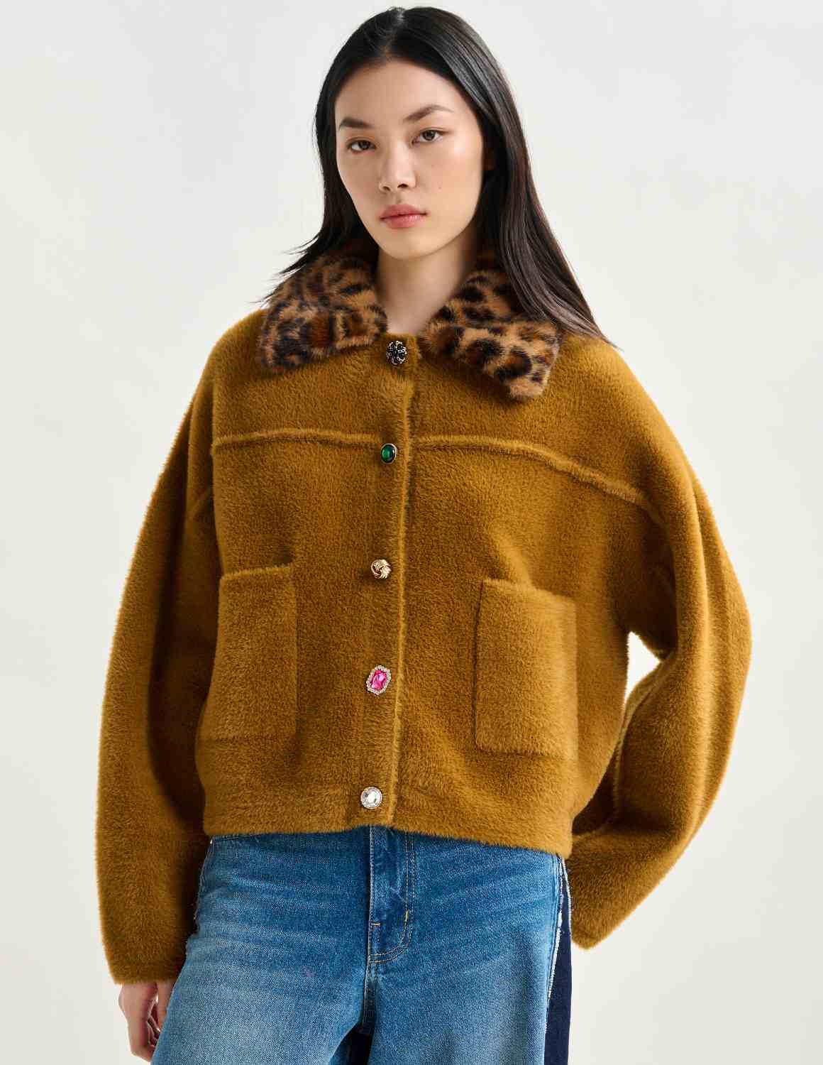 The Intention cardigan / jacket from Essentiel Antwerp is an eye-catching piece, designed in their iconic fuzzy knit. Featuring a mix of playful, mismatched buttons along with two functional patch pockets. This piece blends quirky charm with everyday comfort. The standout feature? A removable leopard-print faux fur collar that lets you switch up your style when you fancy! Perfect for layering or making a statement all on its own.