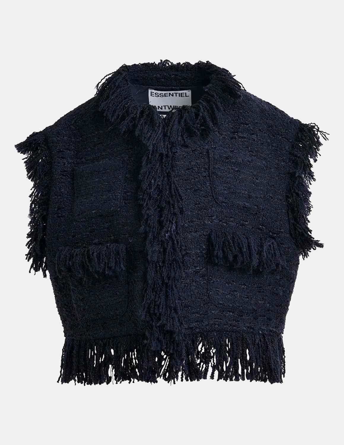 Essential Antwerp Ishani navy gilet is cut from a textured wool-blend bouclé. This sleeveless jacket is cropped to sit just above the waist. It’s designed for a close fit with a structured, boxy shape. The tactile fabric is enhanced by soft fringe detailing along the collar, placket, hem, and patch pockets—adding movement and a hint of playful texture. Fully lined for comfort, it fastens with discreet hook-and-eye closures. Layer it over a crisp shirt or wear it solo for a fresh take on tailoring.