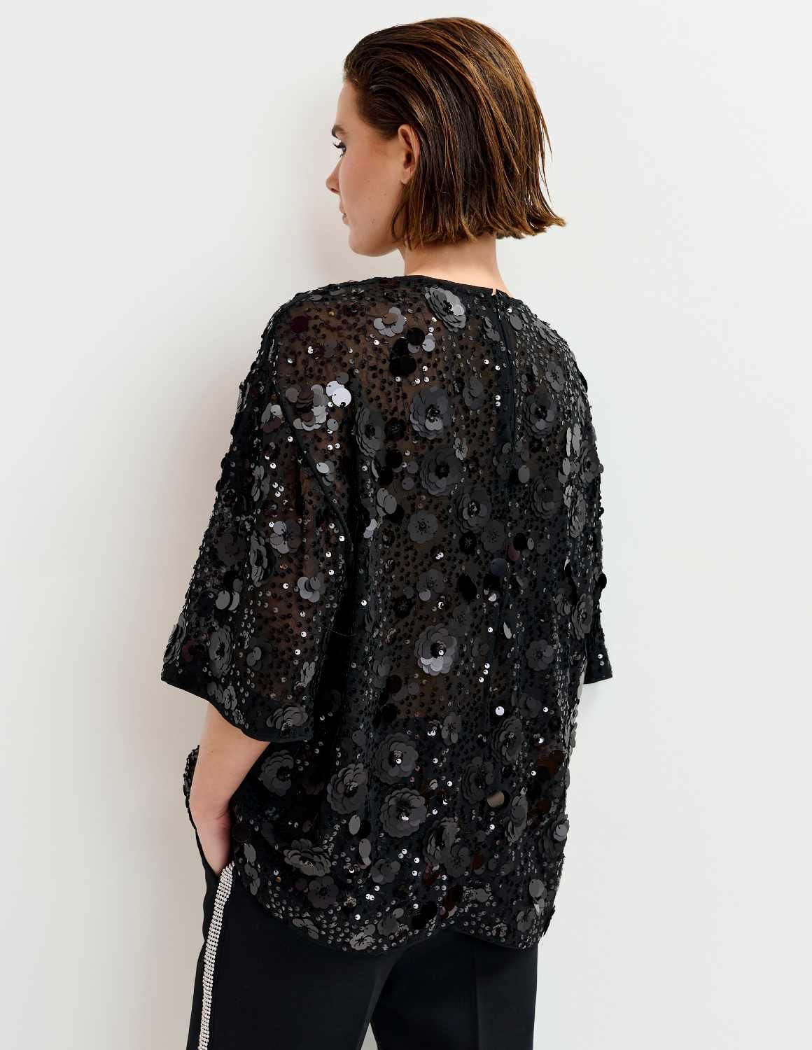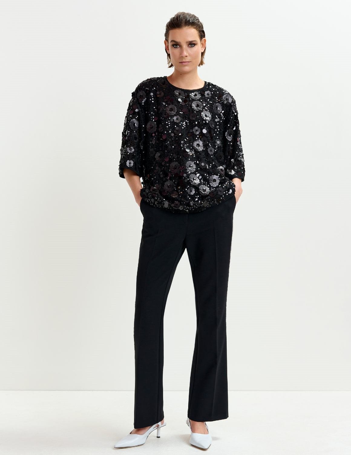 The beautiful Isparkle top from Essentiel Antwerp is an easy way to add some wow to an evening look! It is embroidered with tonal flower sequins and it holds its boxy silhouette, while dropped shoulders and an oversized cut enhance its relaxed structure. Finished with a clean round neckline and a discreet zip fastening at the back. Wear with the Ibell trousers.