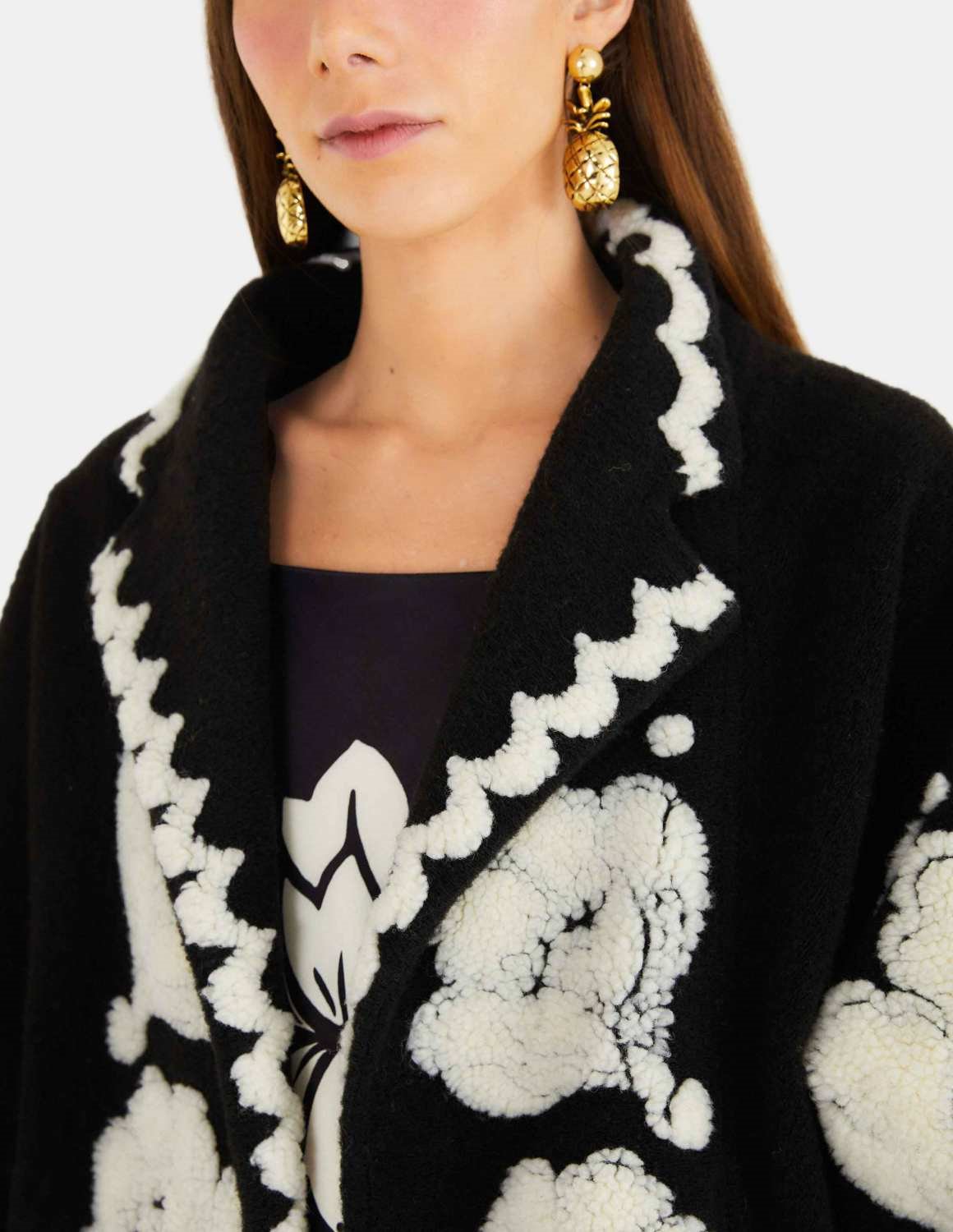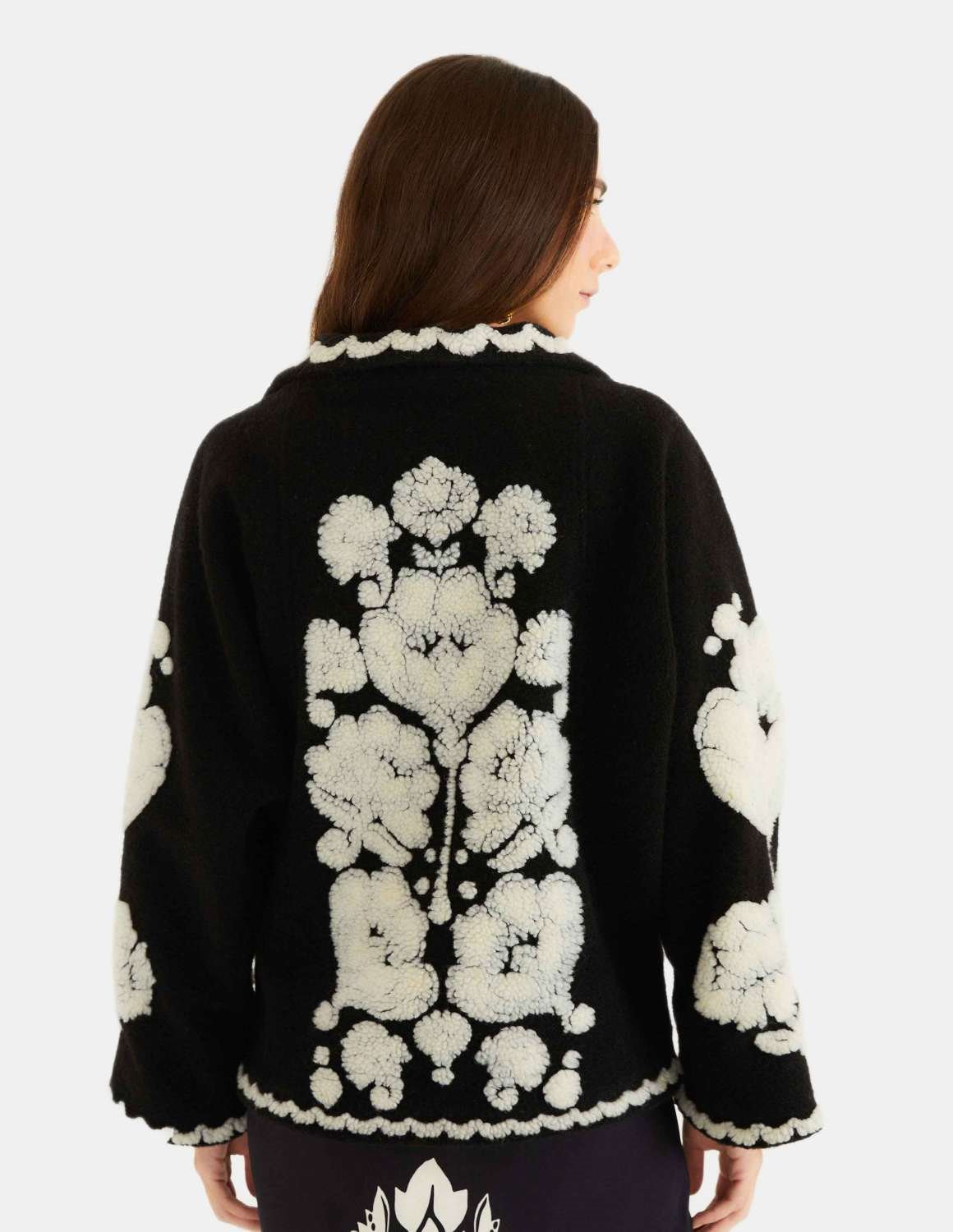 The floral arabesque fleece jacket from Farm Rio was a sell-out last season and we expect it to be the same this autumn. Super stylish in a black & white print on a textured wool mix high pile jacket.