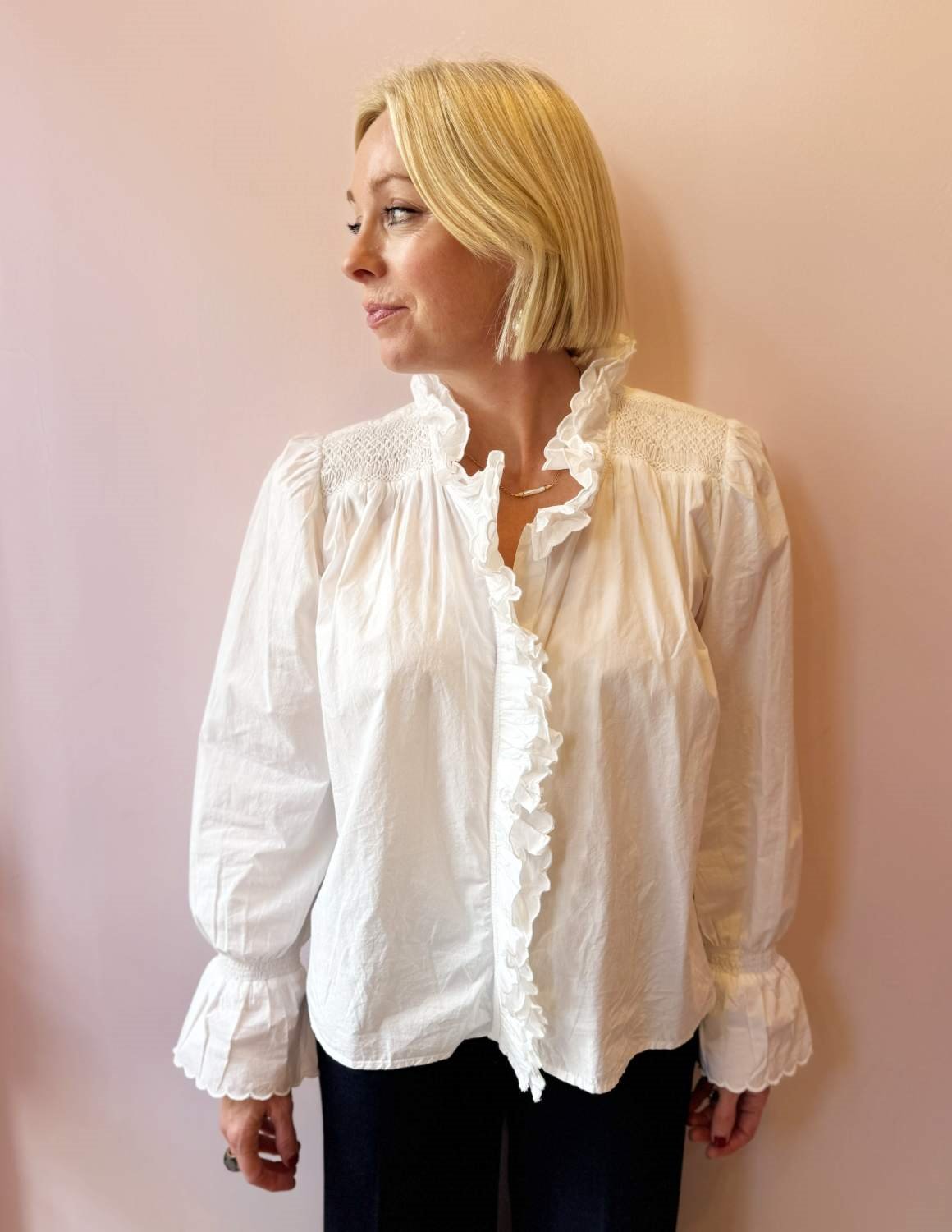 The Yasmina is a beautiful white cotton blouse from French brand, Feeka. With its feminine frill details around the collar, button placket and cuffs, this is the perfect white shirt for a day to night look with super cool Paige Sasha jeans.