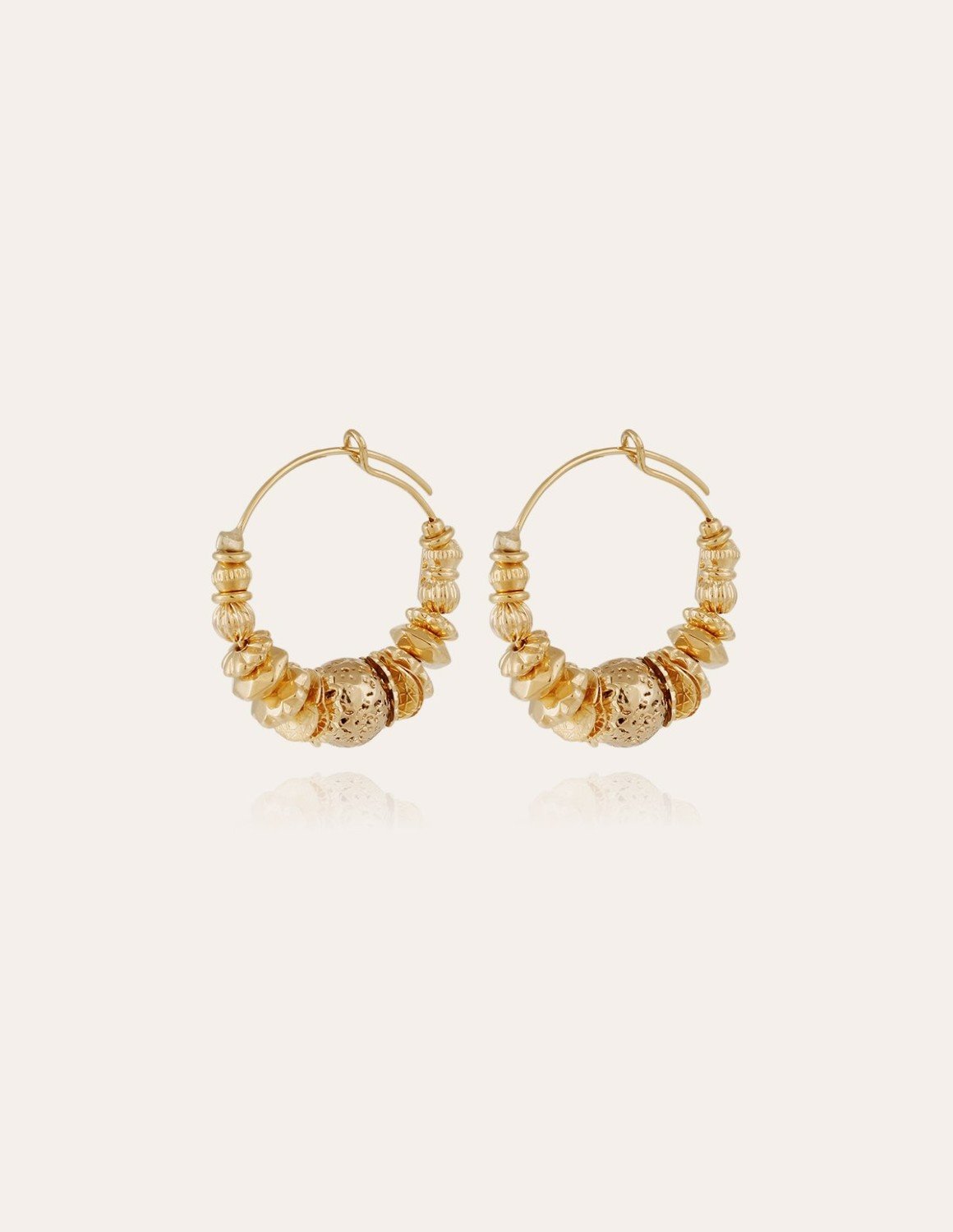 The Aloha mini hoop earrings from Gas Bijoux are gold plated, adorned with beads, golden rings and gemstones. The elements are hand-assembled. - Diameter: 3,2 cm