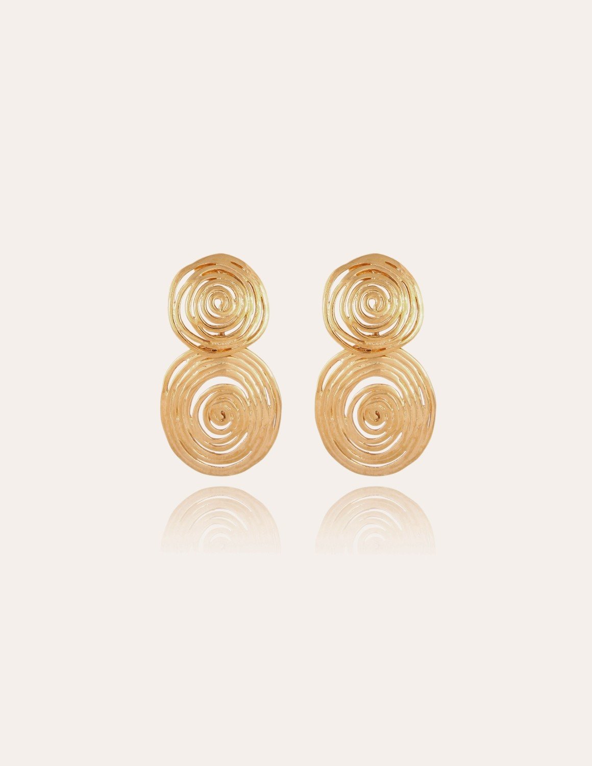 Gold-plated earrings finely worked of stacked metallic threads inspired by a trip to Africa.