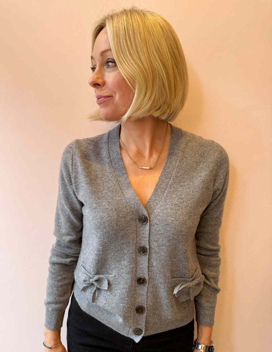 This bow pocket cardigan from Jumper 1234 is made from pure cashmere and comes in a lovely mid grey. Designed with a v-neck and dark grey buttons, it also features patch pockets with cute bows. Ideal for layering, this is a fantastically versatile piece for your autumn-winter wardrobe. Also available in sandstone.