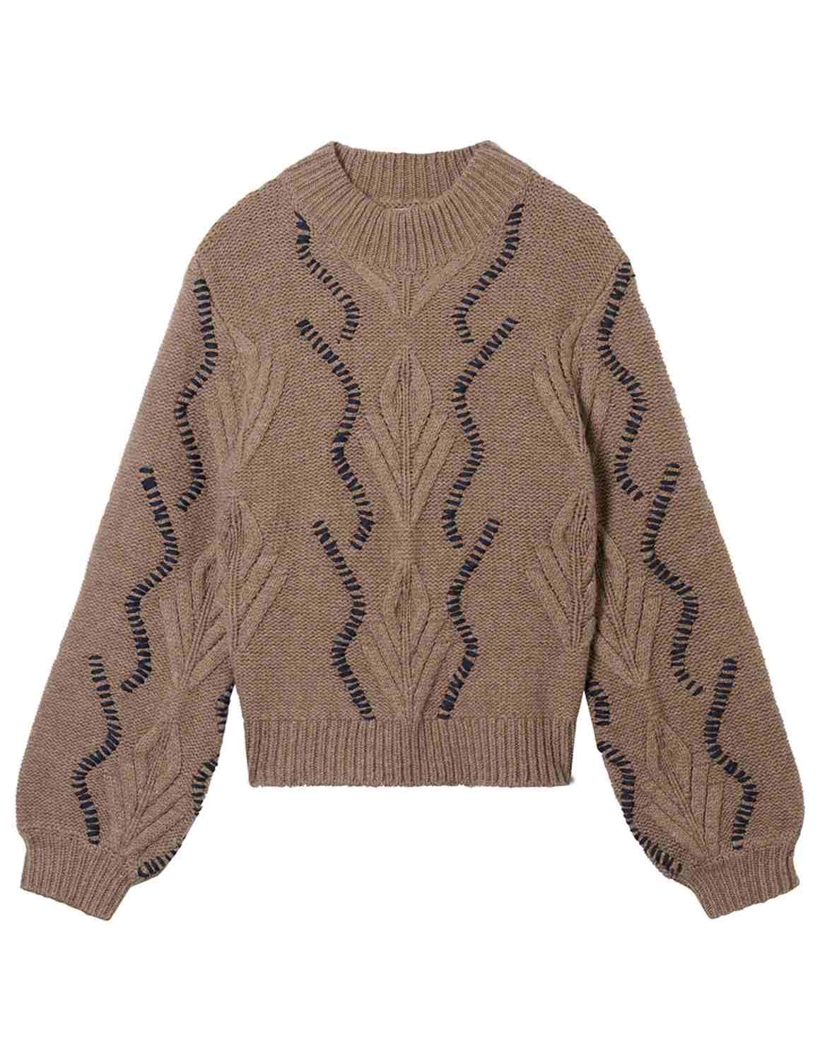 Jumper 1234 cashmere and wool jumper. Heavy weight Aran jumper in moose with navy stitch detail. Balloon sleeves and a turtle neck, Slightly oversize fit and also available in grey. Heaven in a jumper?