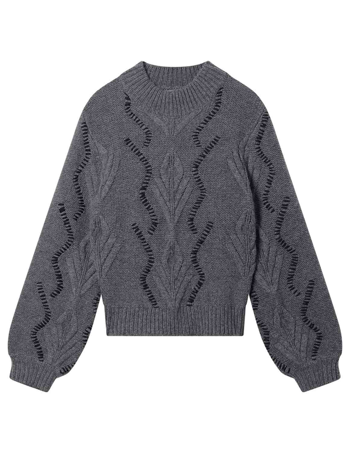 Jumper 1234 cashmere and wool jumper. Heavy weight Aran jumper in grey with navy stitch detail. Balloon sleeves and a turtle neck, Slightly oversize fit and also available in moose. Heaven in a jumper?