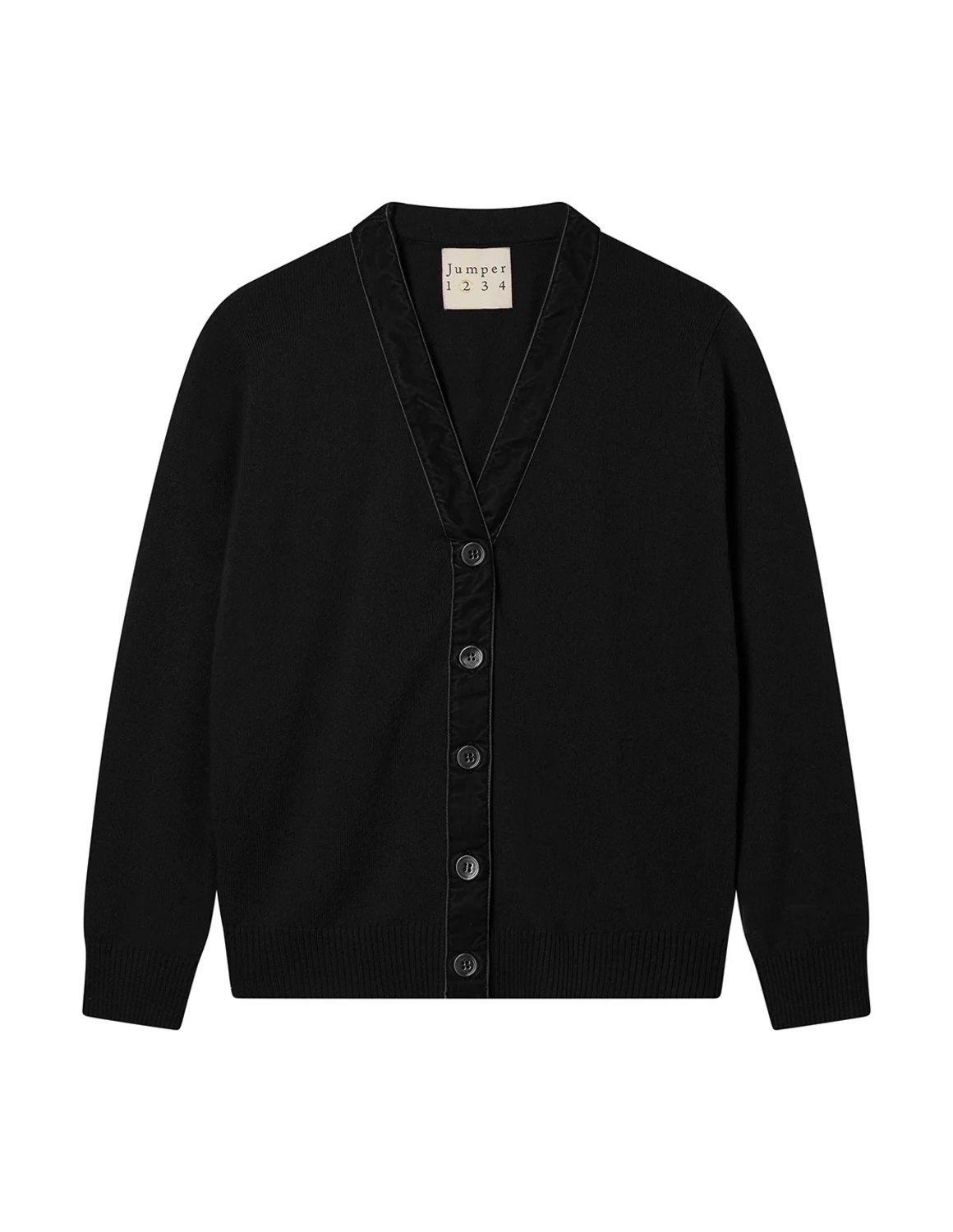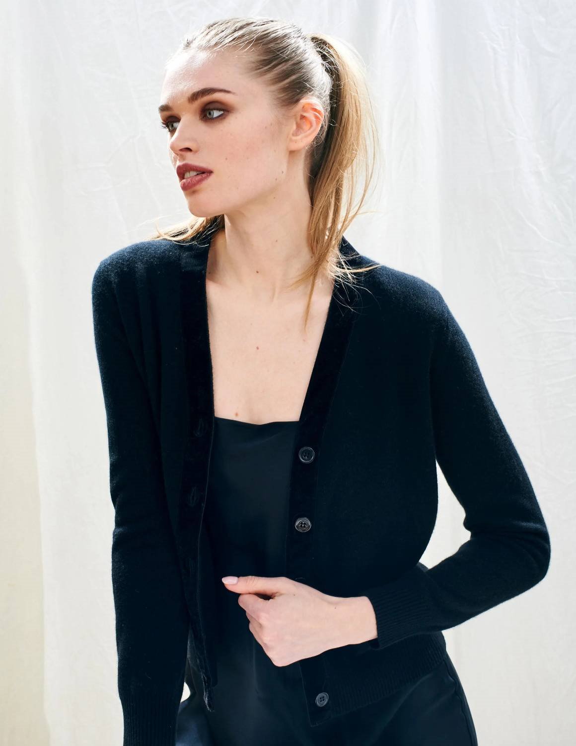 How lovely is this new velvet trimmed cardigan from Jumper 1234. A really useful vee neck cardigan in a fabulous cashmere and wool blend with matching velvet trim. This is going to be one of our go to cardigans this season, it's a neat fit so do size up if you want a more boyfriend fit.