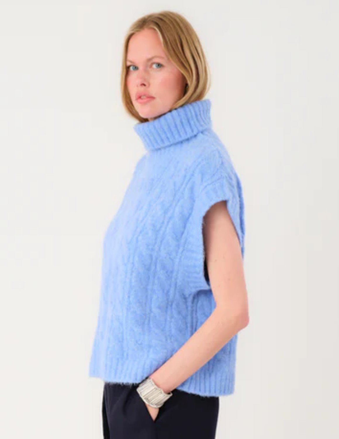 The FresnoLL tank top from Lollys Laundry is a soft knit with a classic cable pattern and high neck. It comes in three beautiful colours – sand, blue, and navy – and features a relaxed fit with ribbed edges at the hem and armholes. The perfect layering piece for autumn looks.