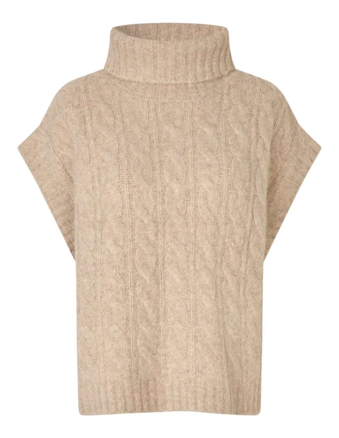 The FresnoLL tank top from Lollys Laundry is a soft knit with a classic cable pattern and high neck. It comes in three beautiful colours – sand, blue, and navy – and features a relaxed fit with ribbed edges at the hem and armholes. The perfect layering piece for autumn looks.