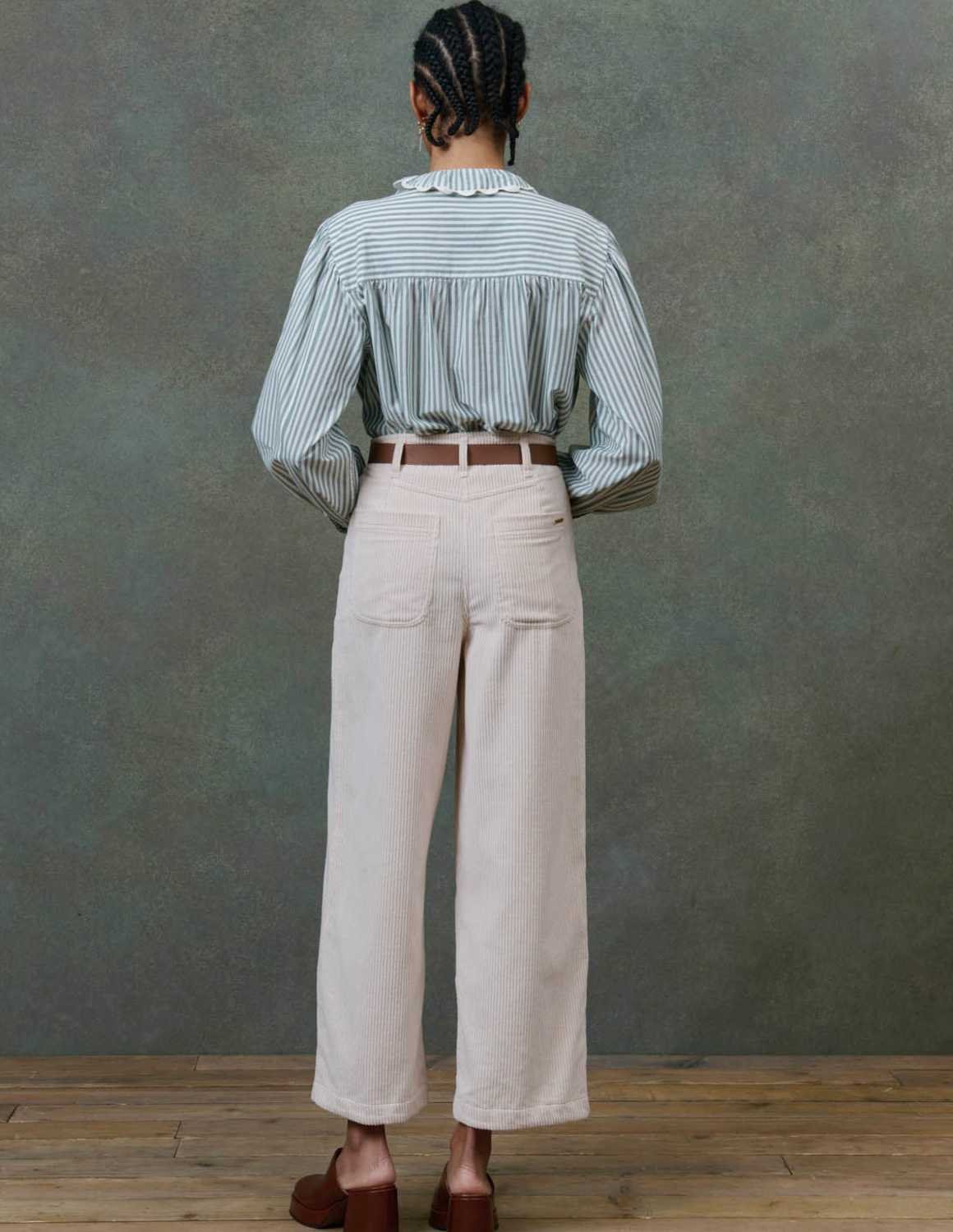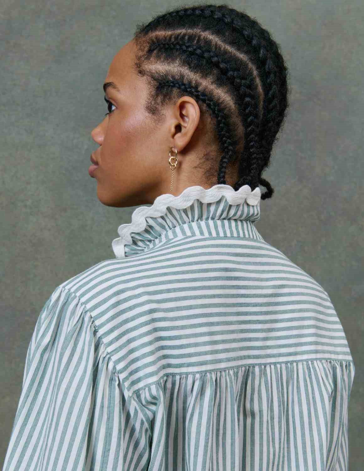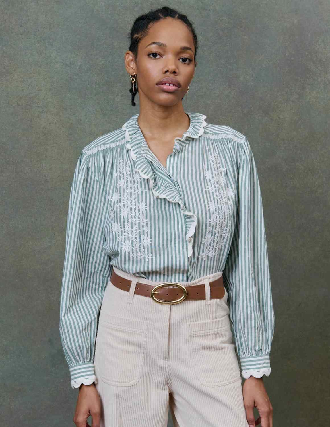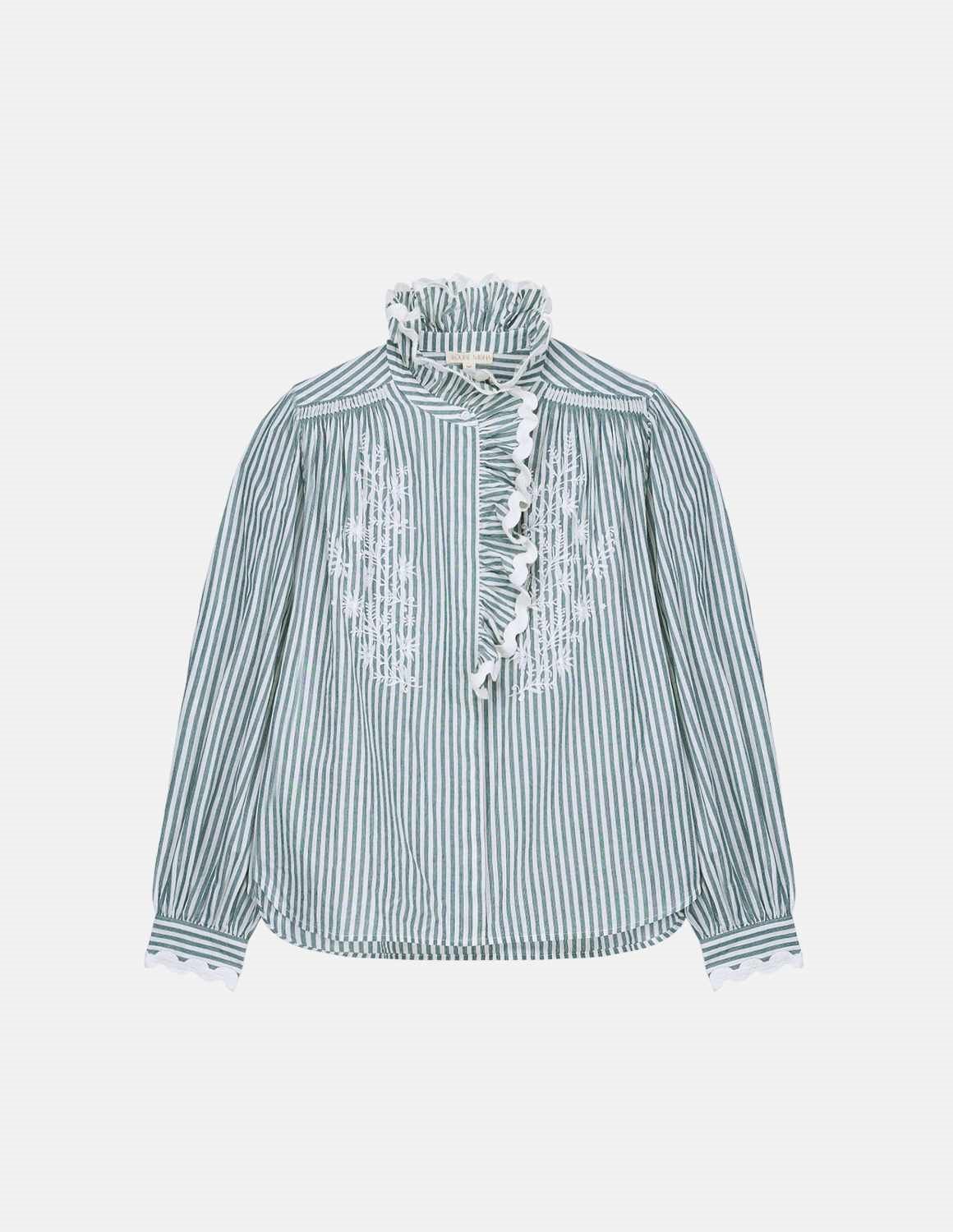 The Cora in almond stripe from French brand Louise Misha, is a pretty, feminine blouse with ruffled collar and puffed sleeves. Made in organic cotton, it also features floral embroidery on the front and sleeves, and a fun rick rack edging detail on the cuffs and collar. it is front closing with a hidden button panel and also has buttoned cuffs.