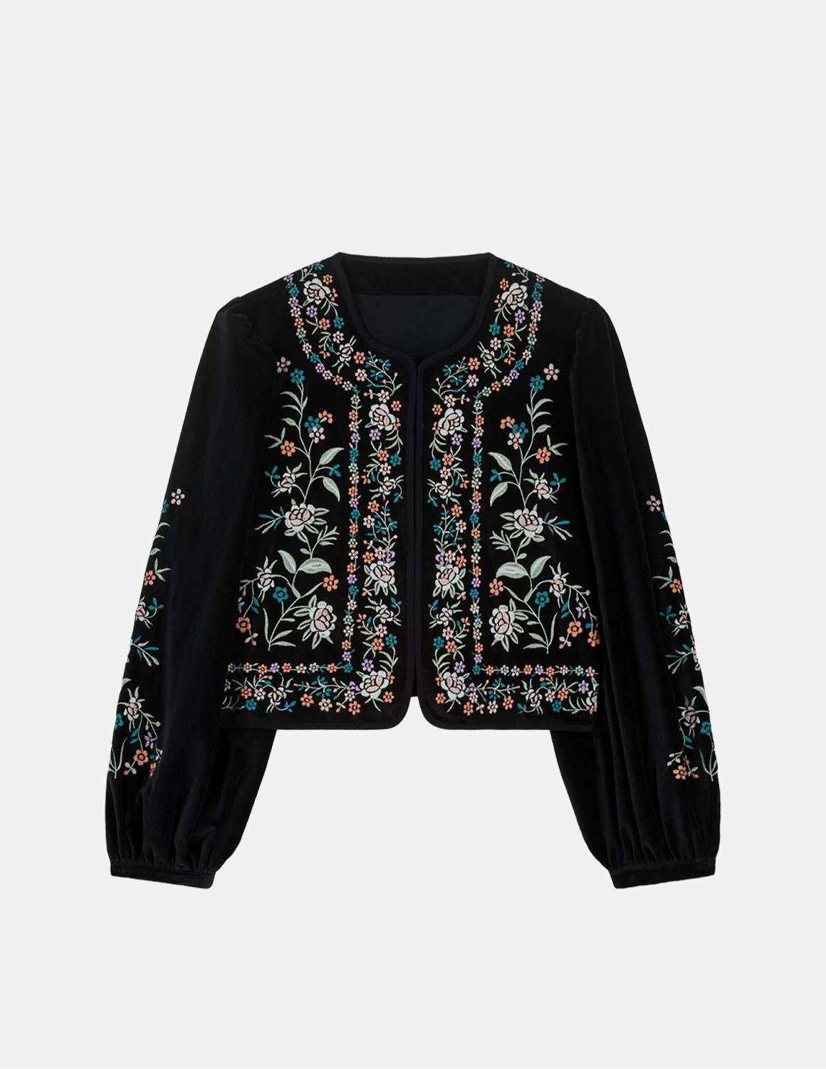 The Duras from French brand Louise Misha is a beautiful cotton velvet jacket with floral embroidery on the front, back and sleeves that will instantly dress up any outfit. Coming in a cropped length with puffed sleeves, it has front hook fastening and is fully lined.
