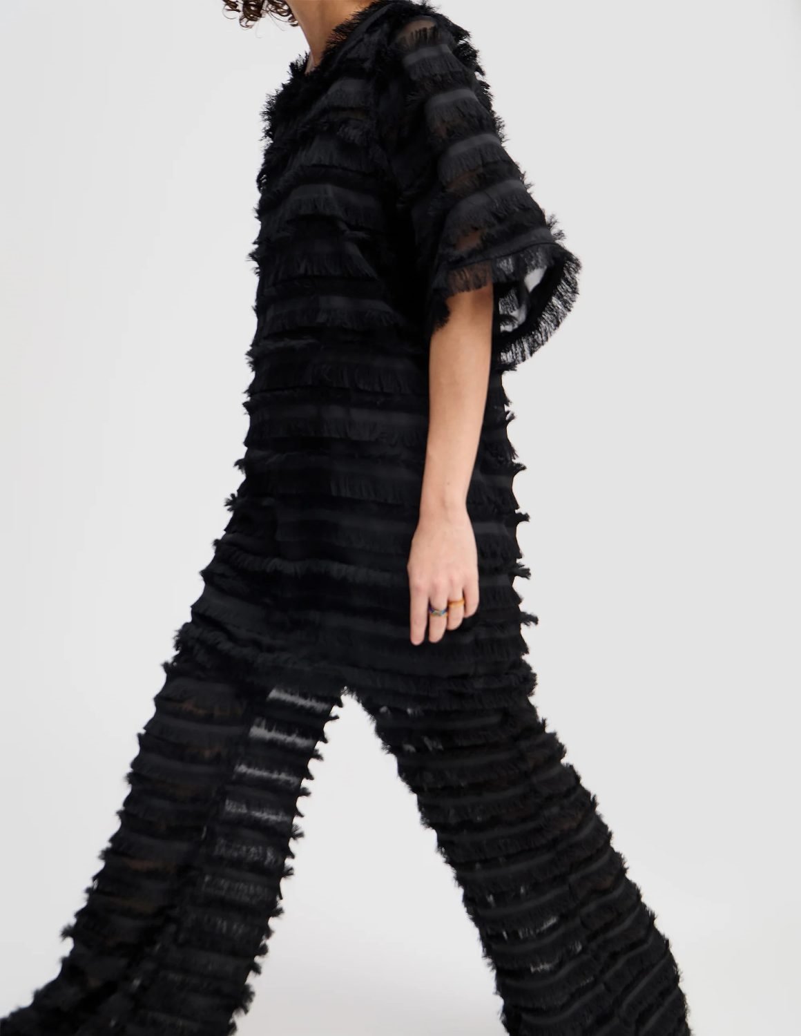 A beautiful, transparent blouse with delicate fringes from Scandi brand, Munthe. The Lipona blouse is designed with a round neckline, dropped shoulders, and wide, beautiful short sleeves.