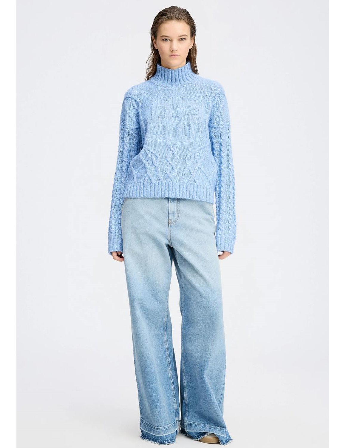 The Loganberry jumper in blue from Munthe is a cosy, oversize cable-knit, perfect for everyday wear. Made from a cotton/recycled polyester mix, it features long sleeves, a high neck and a MUNTHE emblem on the chest.