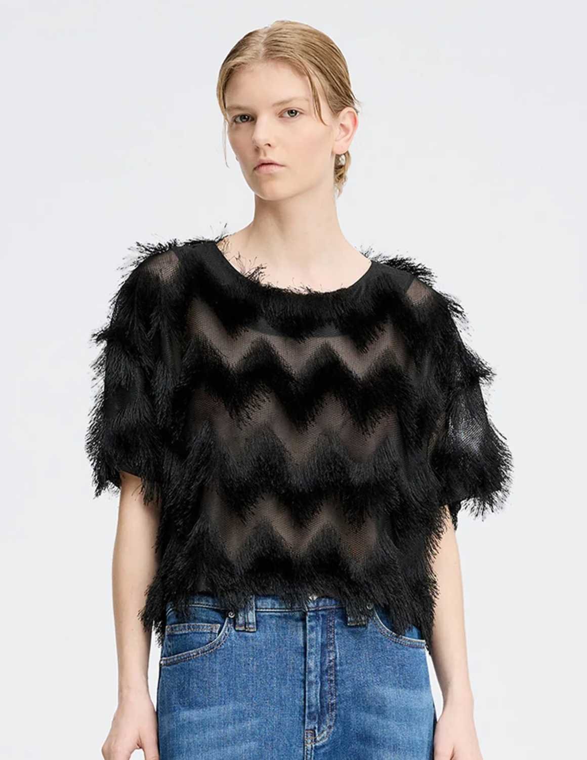 The Rossi is a stylish statement top from Danish brand, Munthe. Designed with short sleeves and a relaxed fit, it is made from a semi-sheer mesh fabric covered with fine fringing in a zig zag pattern.