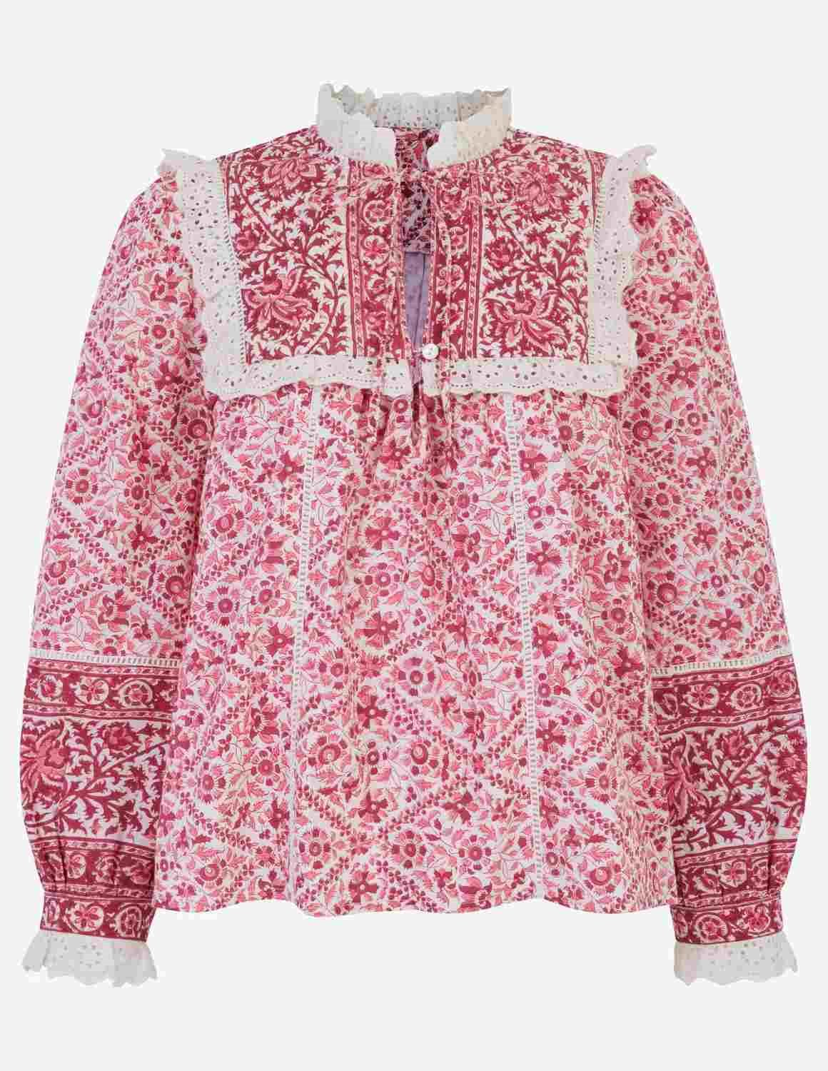 Full of vintage-inspired charm, the Burgundy Patchwork Nettie blouse from Pink City Prints is hand block printed in beautiful shades of deep burgundy and soft pink. Featuring pretty cotton lace trims at the neckline, cuffs, and across the front yoke, this button-front blouse is both romantic and refined. The ties at the neck can be worn loose or fastened for a more polished look. Pair with jeans or white trousers.