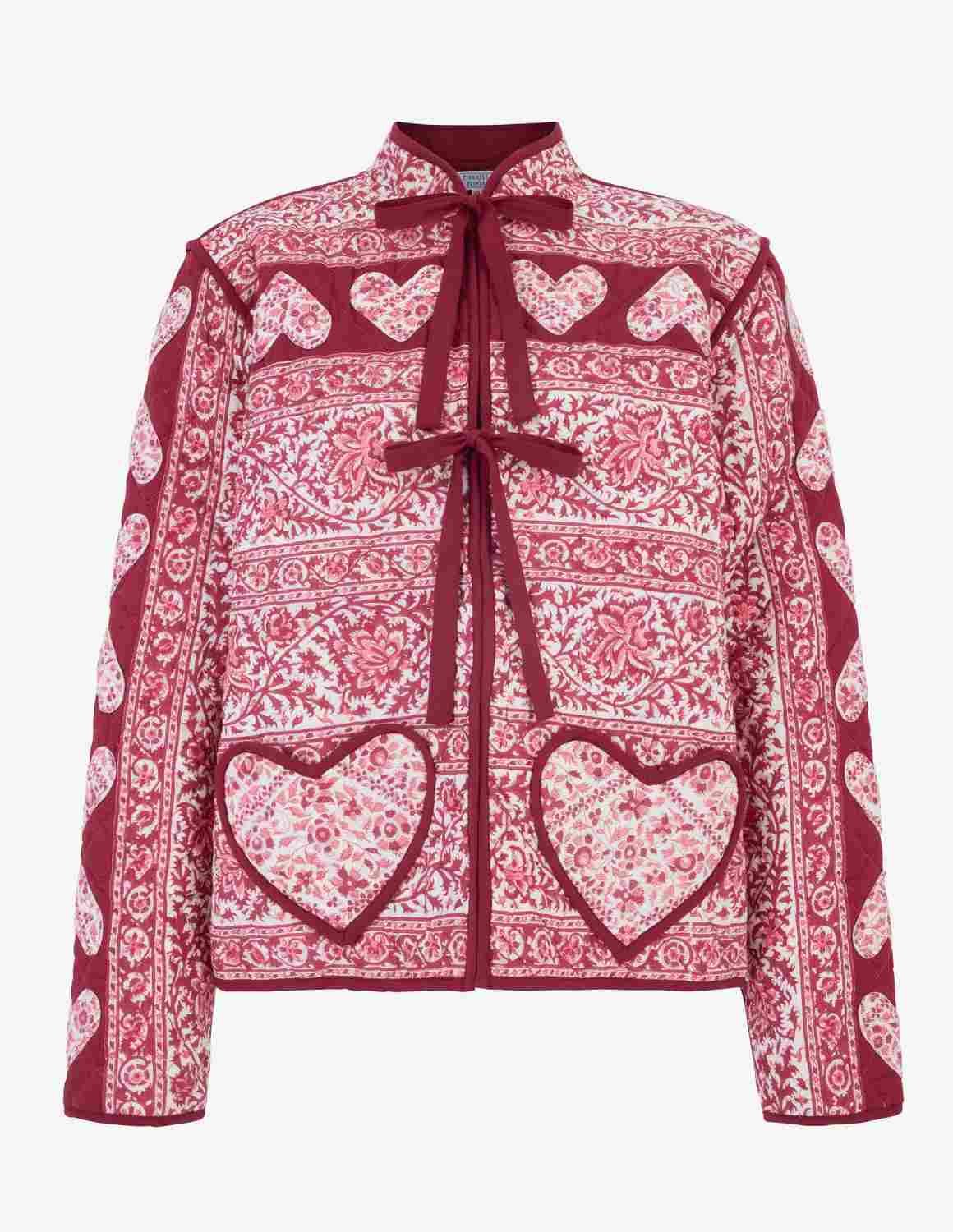 The Penny in Burgundy Patchwork from Pink City Prints is a hand block printed jacket in rich shades of soft pink and deep burgundy. Finished with charming heart-shaped patch pockets and exquisite appliqué embroidery on the sleeves, it’s a timeless design with a playful twist. Made in a quilted fabric with a boxy shape, it's perfect for a lighter outer layer. Wear with jeans for easy, everyday style.