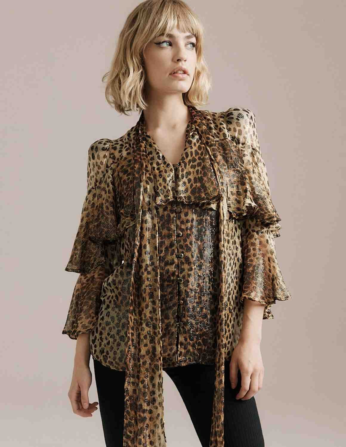The Bea blouse from Queens of Archive combines the decadent energy of Studio 54 with unapologetic feminine flair. Crafted from sheer lurex chiffon in a bold cheetah print, the fabric catches the light with a soft, sultry shimmer. Softly gathered sleeves, cascading frills and an elongated necktie conjure vintage drama with a sense of playful confidence.