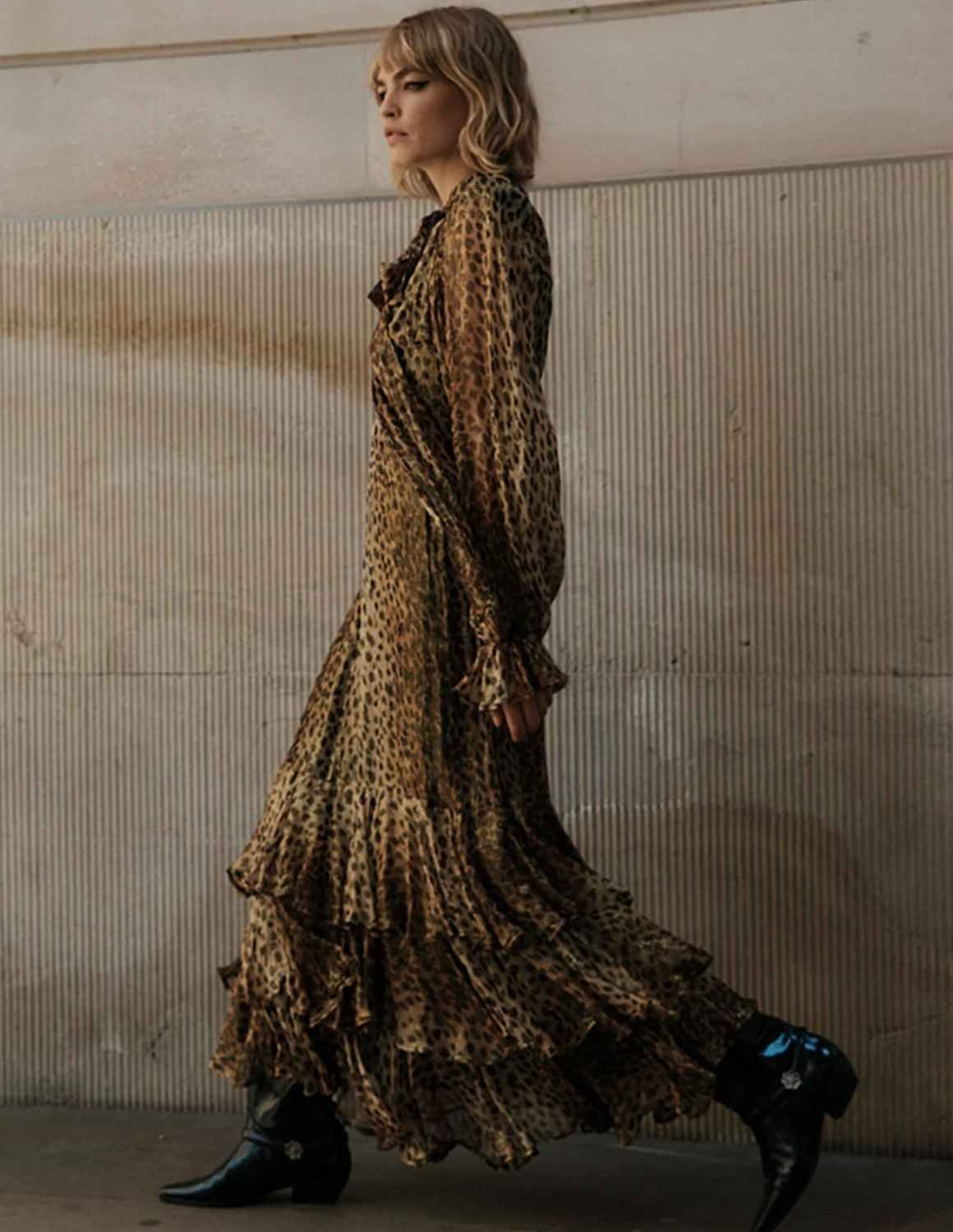 We are delighted to introduce you to the Farrah from Queens of Archive. Designed in a beautiful cheetah print lurex chiffon, this stunning maxi dress catches the light in a slow, liquid shimmer. The cascading skirt sweeps the floor in rhythmic waves, while the self-tie neck drapes with effortless 70s glamour.