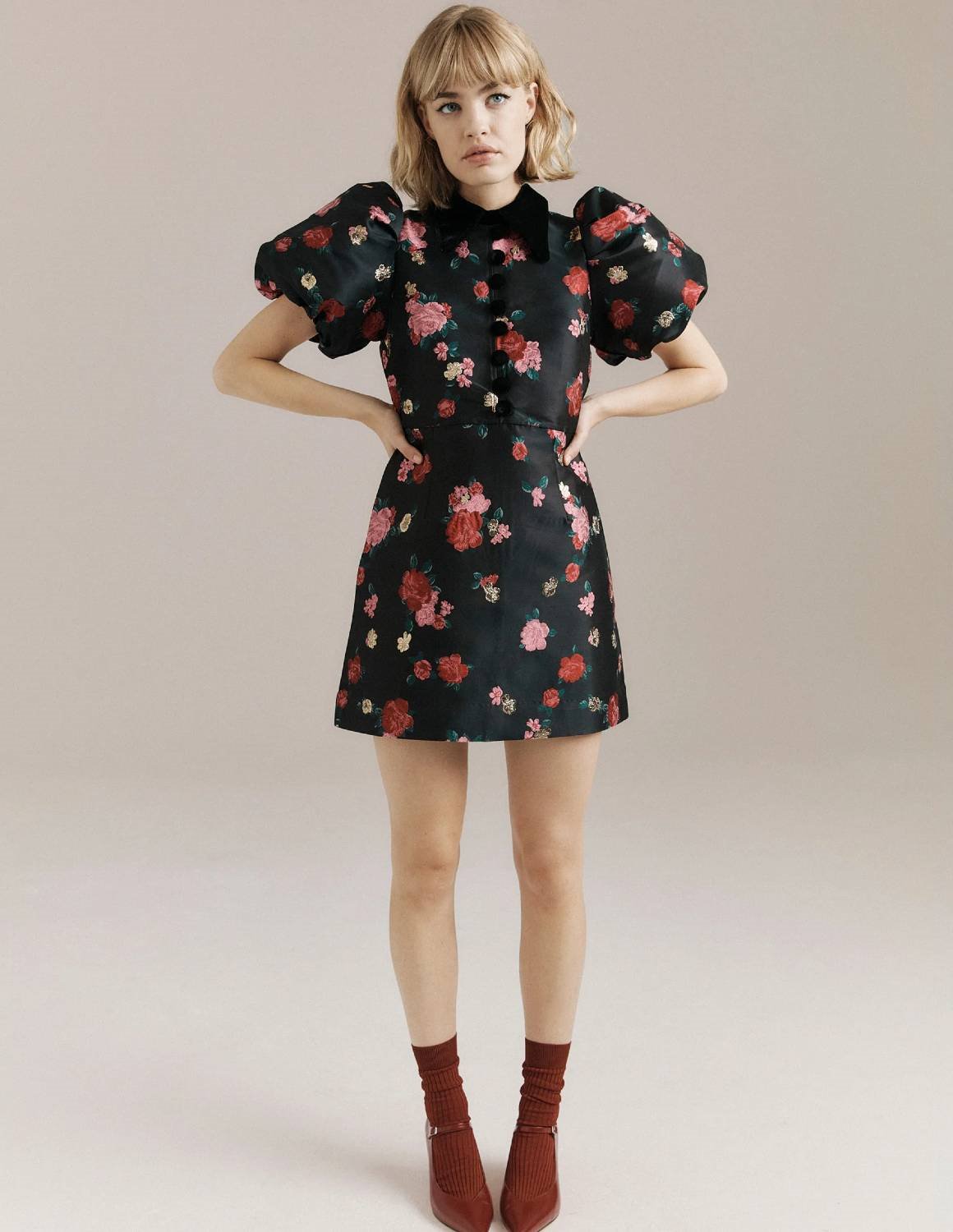 A Queens of Archive favourite returns in a limited run. The Rosie mini dress is cut from bespoke vintage rose jacquard, a tapestry of crimson, blush, and glints of gold that catch the light. The black velvet collar and mock covered button front frame the fitted waist, while sculpted puff sleeves add a touch of playful drama.