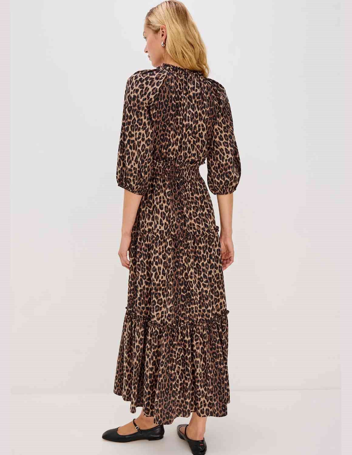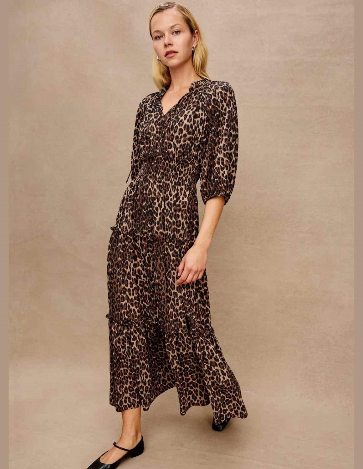 Fits true to size The Caterine from Rails is a tiered maxi dress in a warm brown animal print, on point for the new season. Featuring a shirred neckline and a smocked waist for a cinched silhouette this dress is flowy, feminine and functional. Easily dressed up or down depending on the occasion, the Caterine can do it all.