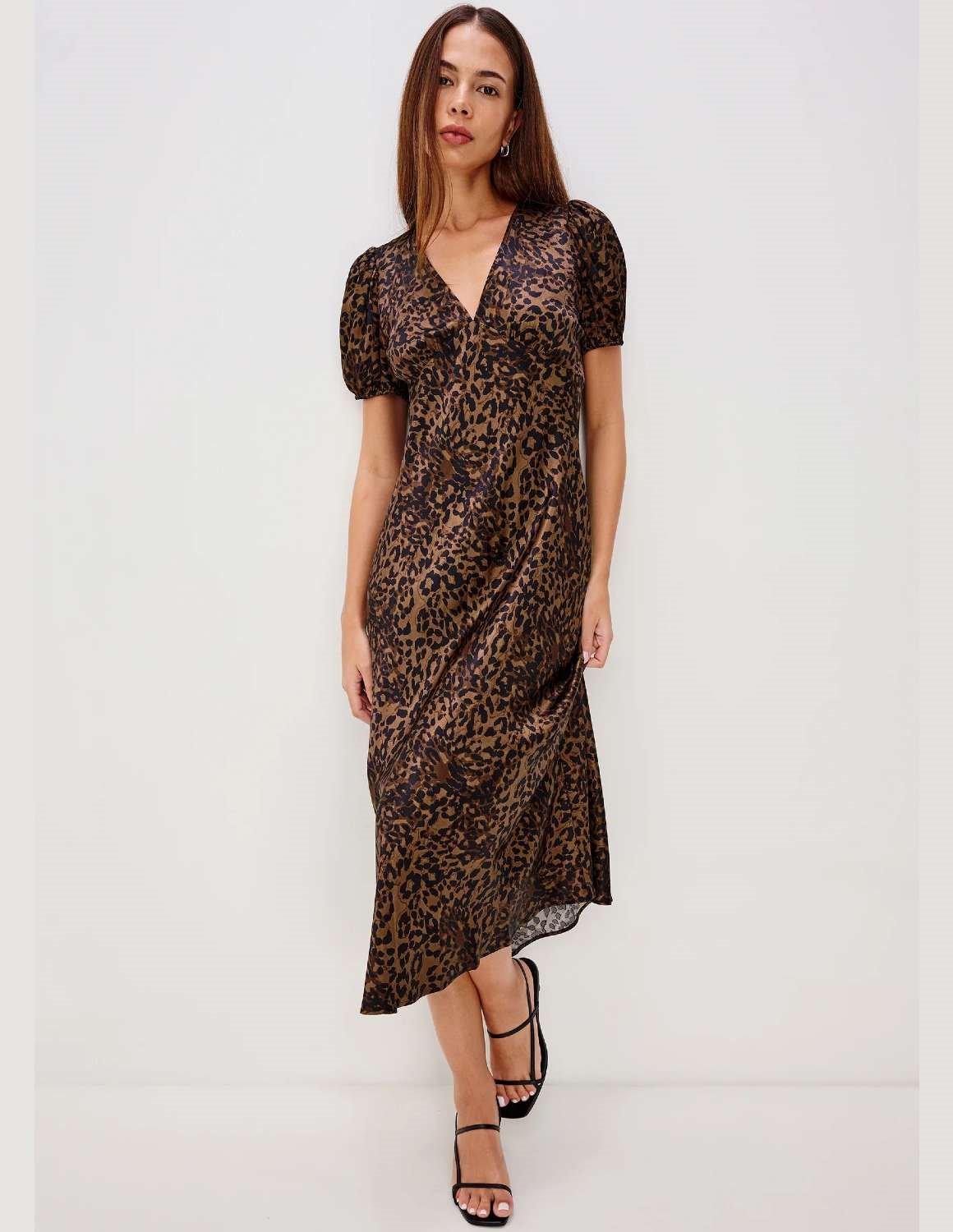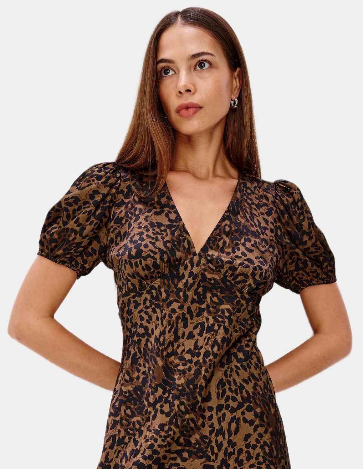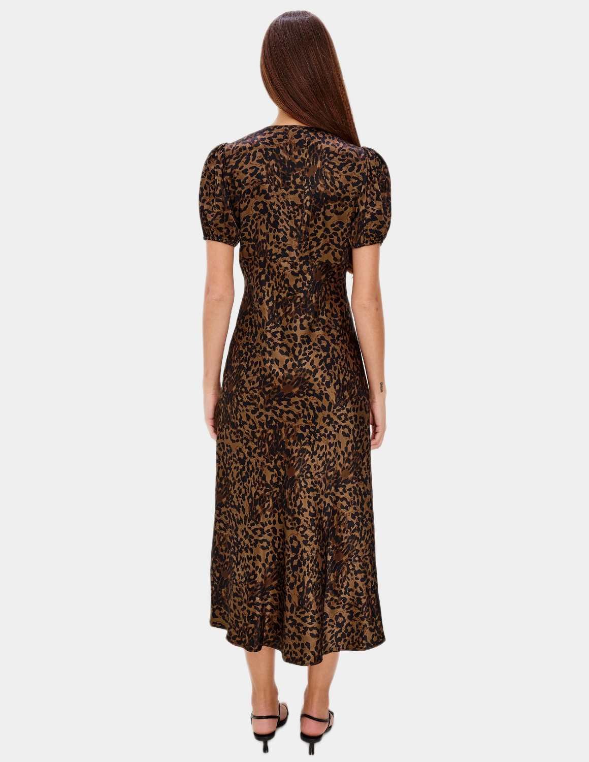 The Junia from Rails pairs an elegant silhouette with a playful all-over leopard print. Designed for a silky-smooth feel and sophisticated drape, this body-skimming midi dress features a V-neckline, subtly ruched bust cups, short puff sleeves with elastic cuffs, and a slip-on design for effortless, go-anywhere style.