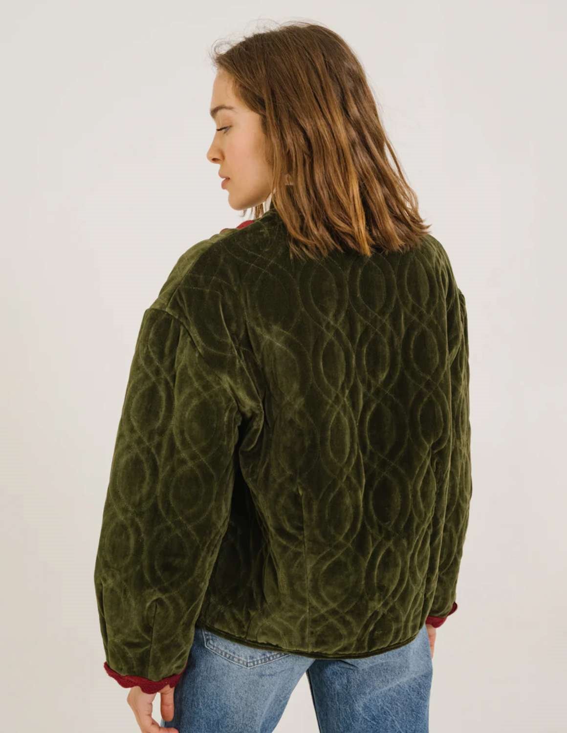 Sacrecoeur deliver on quality and style every time, and this Jay jacket is just perfection! This bomber style jacket in khaki quilted velvet is fully lined, and is both warm and elegant. Highlighted by contrasting cerise zigzag braids, it has a beautiful design with wide sleeves. A bomber style collar, patch pockets and visible buttons complete this super cool jacket.