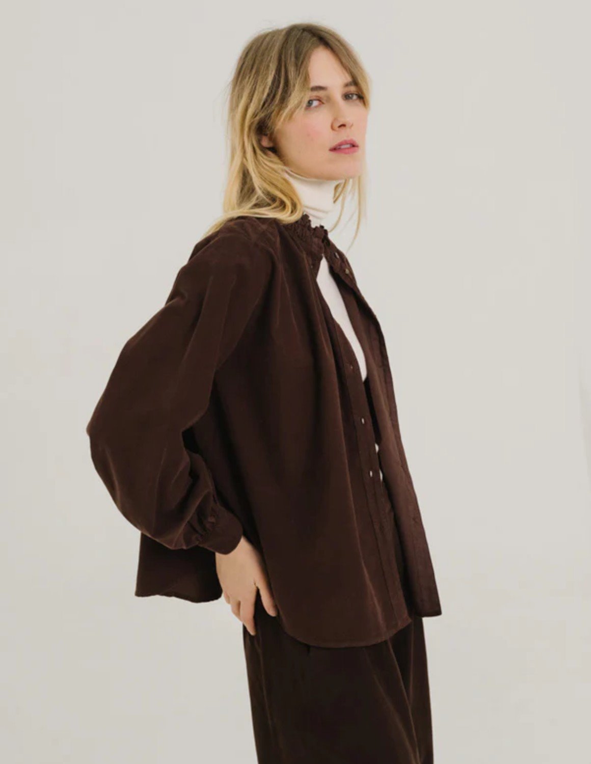 We love the Soline blouse from French brand, Sacrecoeur, it is perfect for every day. A feminine blouse in a rich coffee colour, crafted from baby cord cotton with a soft and delicate feel. Its loose, reversible cut allows it to be worn with the buttons at the front or the back, for a variety of looks. Featuring a high ruffled collar, exposed buttons, and buttoned cuffs, it is gathered at the front, back, and cuffs for a light and romantic silhouette.