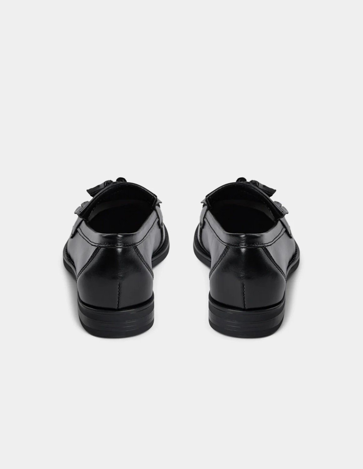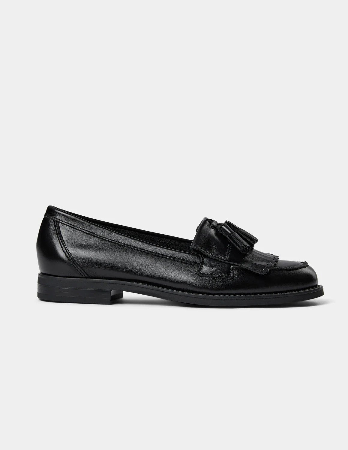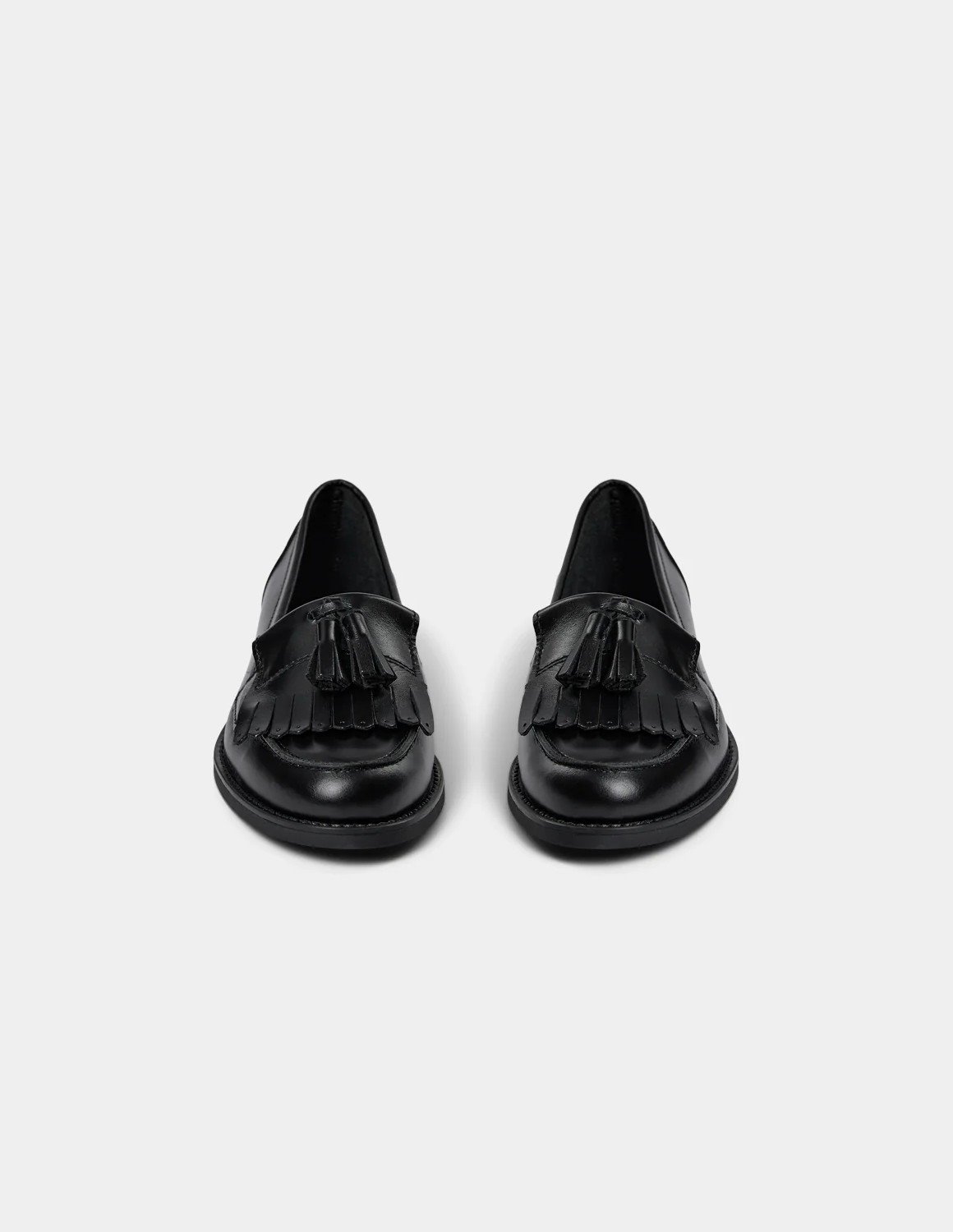 The OliviaSW black loafers from Sofie Schnoor feature a classic design with fringe details and a low heel, giving them a timeless and elegant appearance.